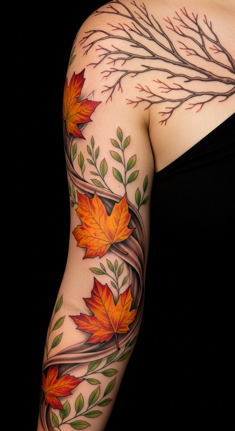 The tattoo’s placement on the forearm and collarbone serves as a constant reminder of the beauty in transformation and renewal. Each season represented evokes emotions tied to change, resilience, and energy, creating a personal narrative etched into the skin. The interplay of various leaf designs not only celebrates nature’s cycles but also symbolizes the wearer’s journey through different phases of life, making this tattoo a powerful emblem of individuality and growth.