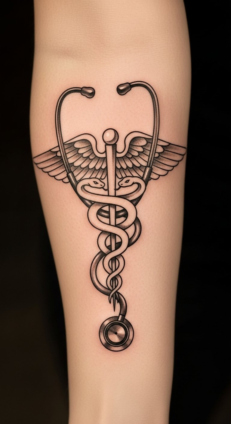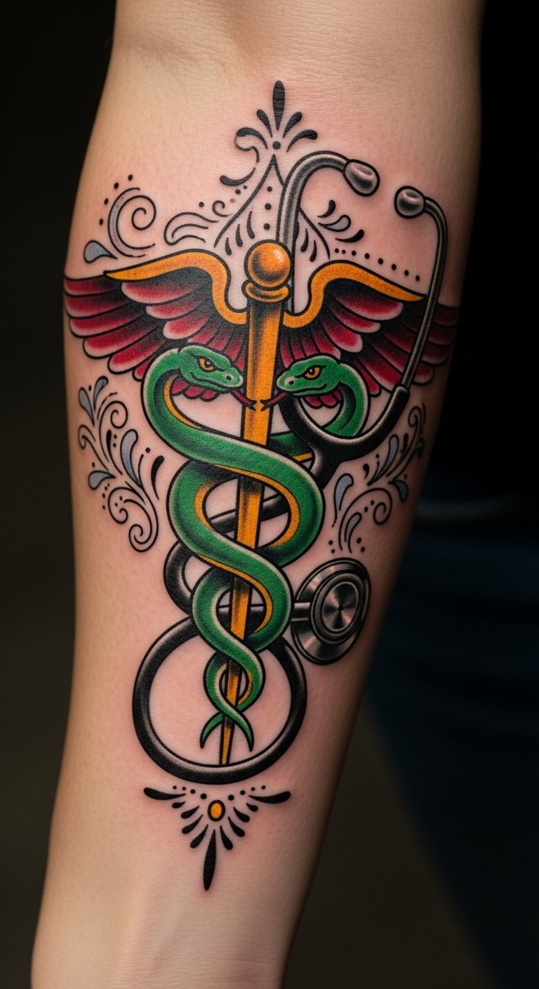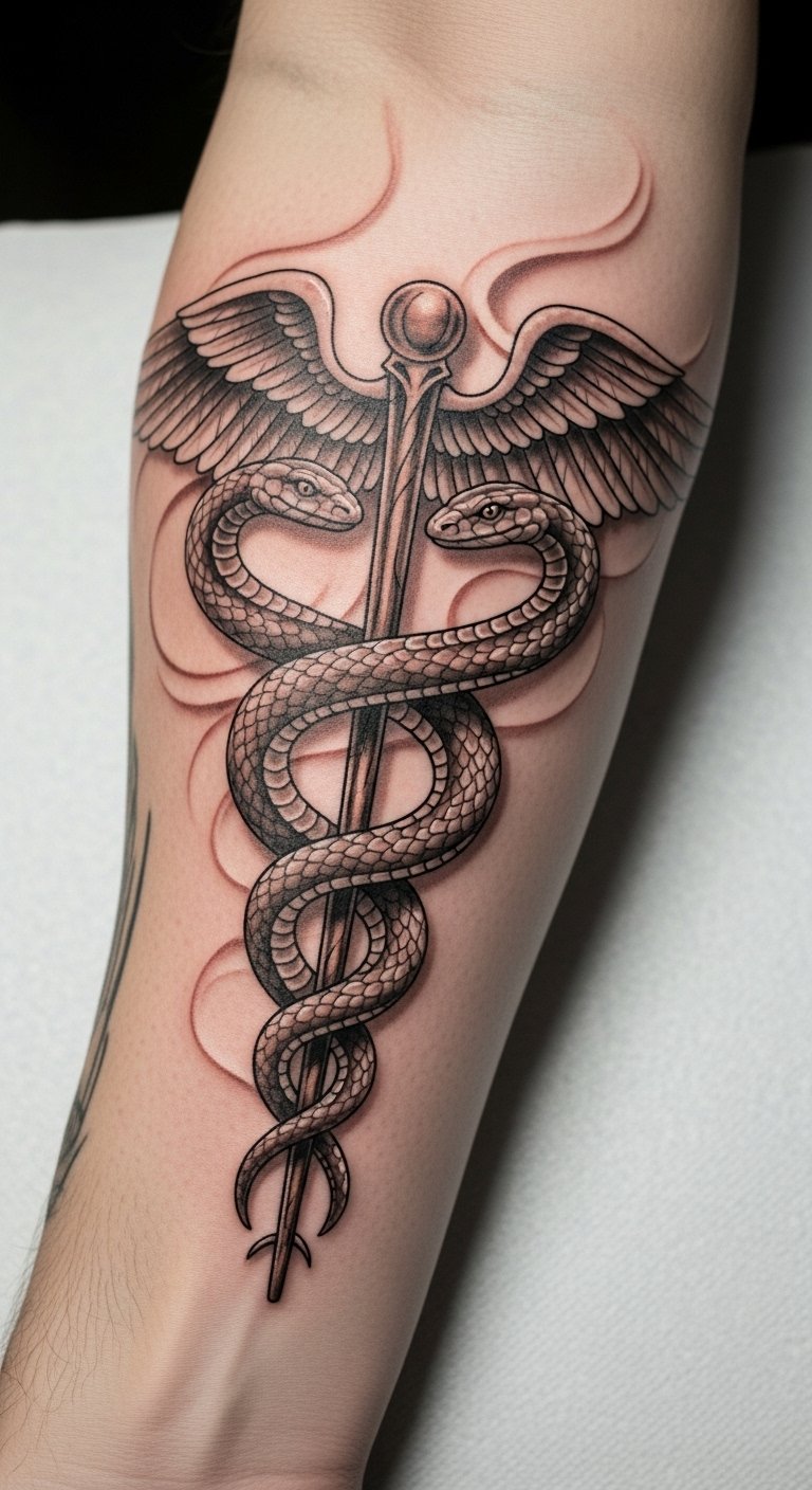The Caduceus tattoo on the forearm symbolizes the profound commitment of a nurse to healing and care. This visible placement serves as a daily reminder of the compassion and expertise that the wearer embodies.