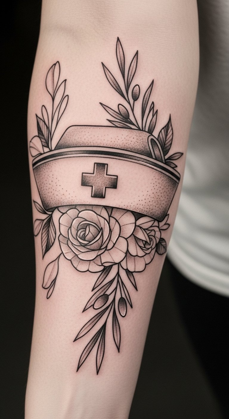 Positioned on the forearm, it transforms the skin into a canvas that tells a story of care and dedication, making it a constant reminder of the vital role nurses play in healthcare.