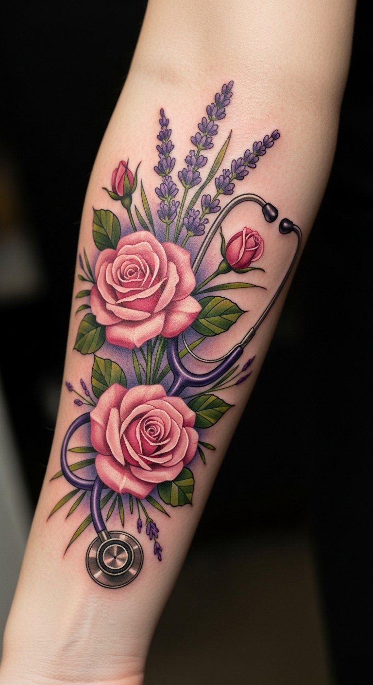 This tattoo symbolizes the profound compassion and empathy inherent in the nursing profession. The roses represent love and care, while the lavender signifies calmness and healing.