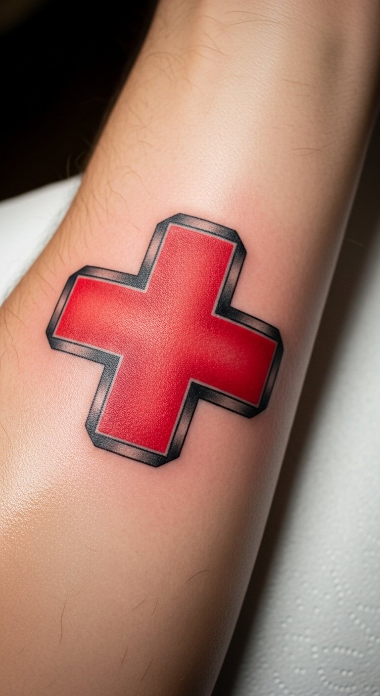 The Red Cross symbol tattoo on the forearm symbolizes a commitment to humanitarian aid and compassion.