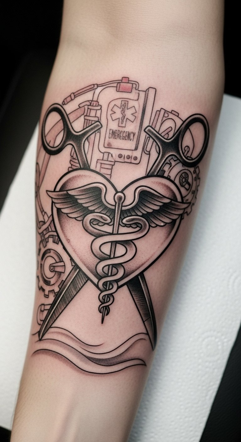 This tattoo design embodies the spirit of nursing, combining essential trauma shears with the symbol of healing.