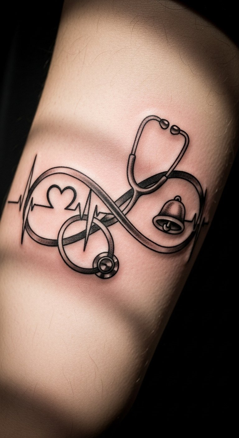The infinity symbol intertwined with a stethoscope and heartbeat line reflects an unending commitment to healing and compassion.