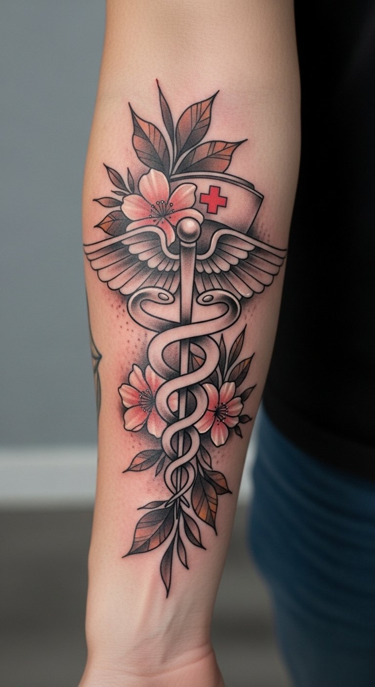 Placed on the forearm, this design not only serves as a personal reminder of one’s dedication but also inspires others who see it, showcasing the strength and beauty found in the healing arts.