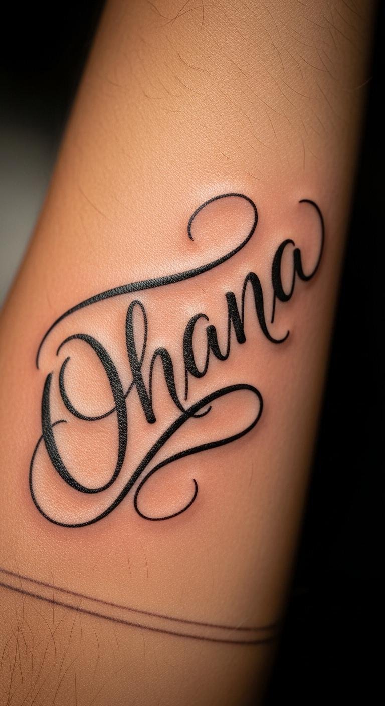 This tattoo, positioned on the forearm, serves as a constant reminder of the essence of Ohana, symbolizing the strength and unity of family bonds.