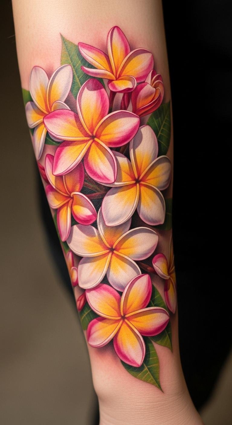 This tattoo beautifully symbolizes the deep connections and love within a family. The plumeria flower represents positivity and new beginnings, while the intertwining symbols reflect the unique stories and bonds shared among family members. Placing this design on the forearm allows for easy visibility, making it a constant reminder of cherished relationships and the importance of unity in one’s life.