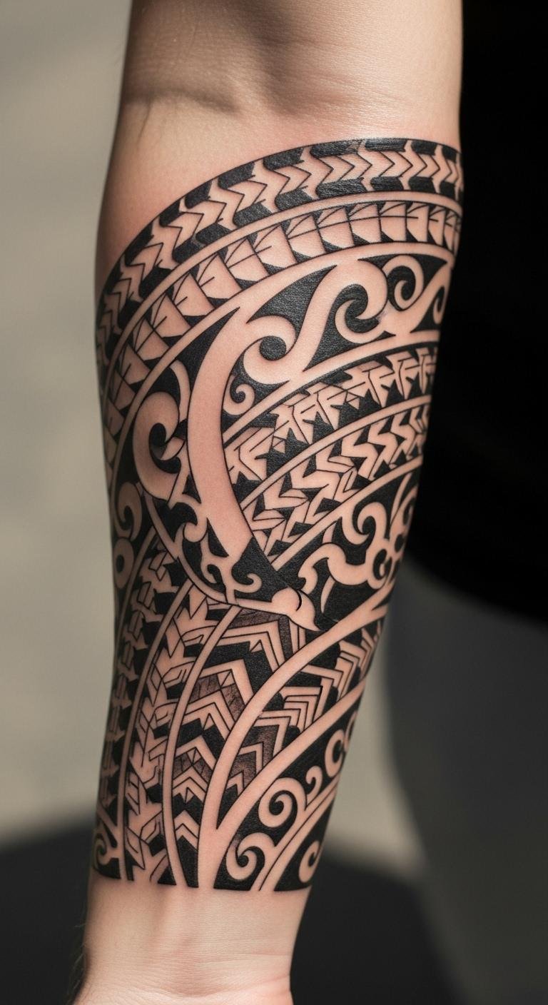 This tattoo design on the forearm embodies the essence of Polynesian culture, where each wave and twist symbolizes the connection to family and ancestral ties.
