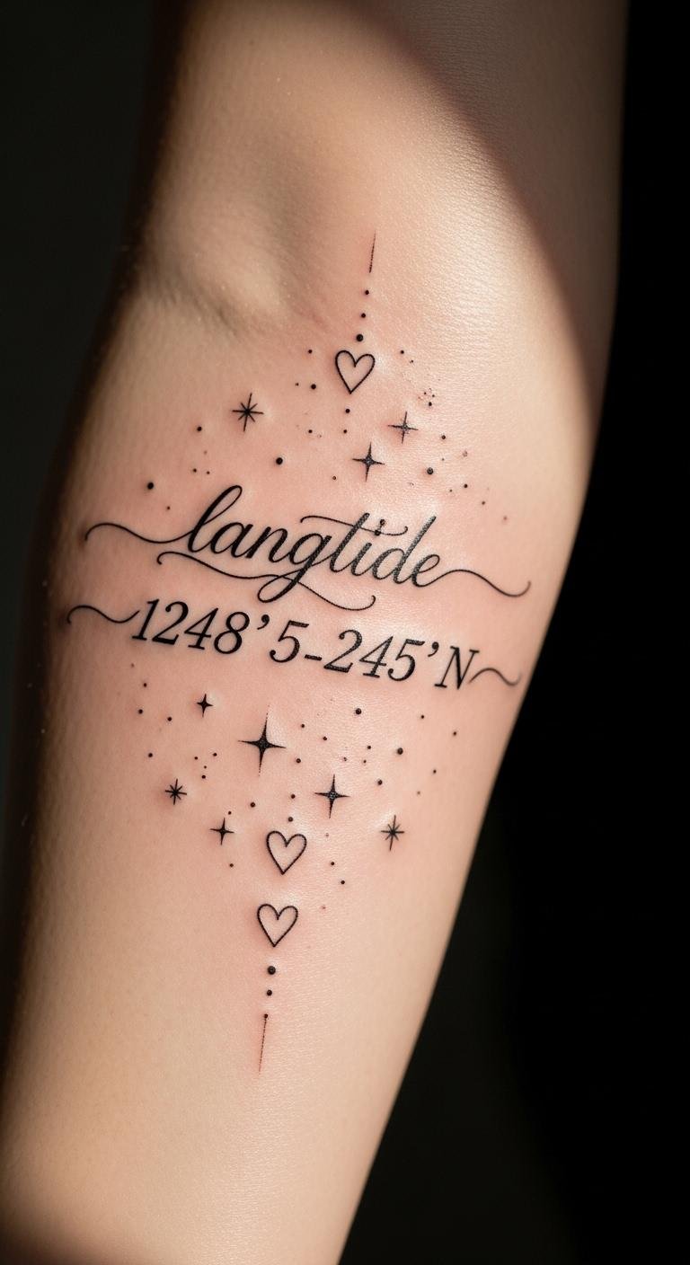 The choice of script and decorative elements adds a touch of artistry, transforming simple coordinates into a personal emblem of cherished memories and deep connections, making it a beautiful homage to one’s heritage and relationships.