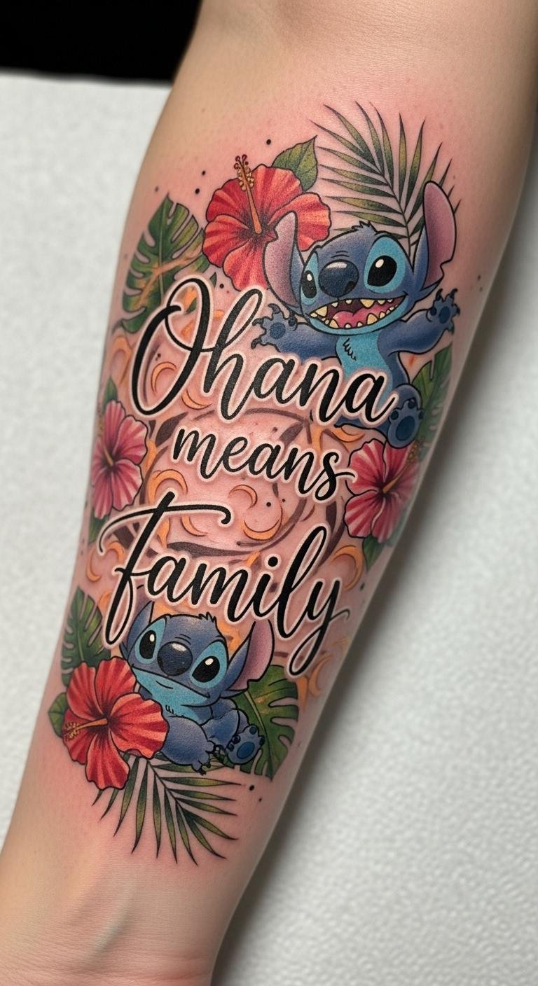 This tattoo serves as a beautiful tribute to the themes of love and belonging found in “Lilo & Stitch.”