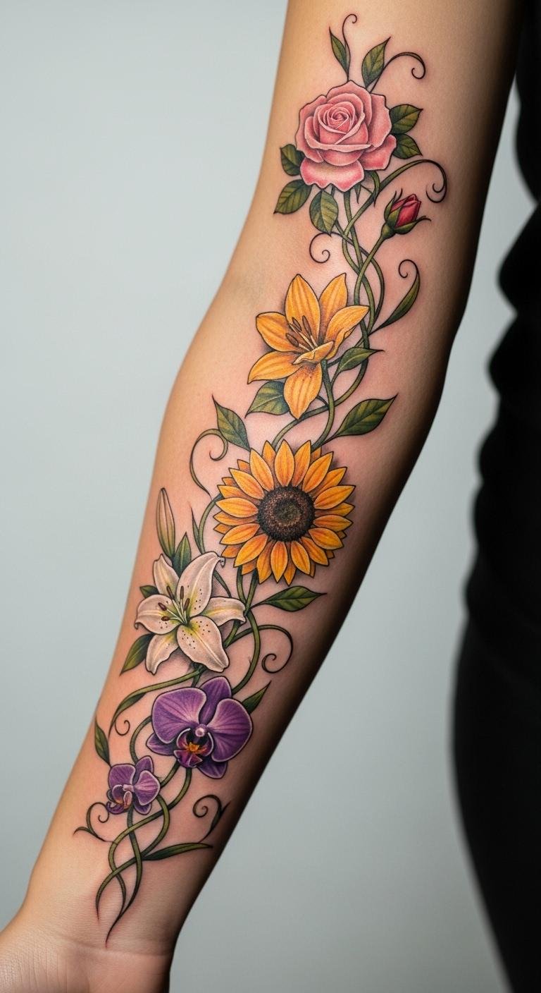 This tattoo serves as a vibrant reminder of love and unity, placed on the forearm where it can be easily seen and appreciated. It reflects shared experiences and memories, inviting conversations and connections with others, celebrating the family journey together.