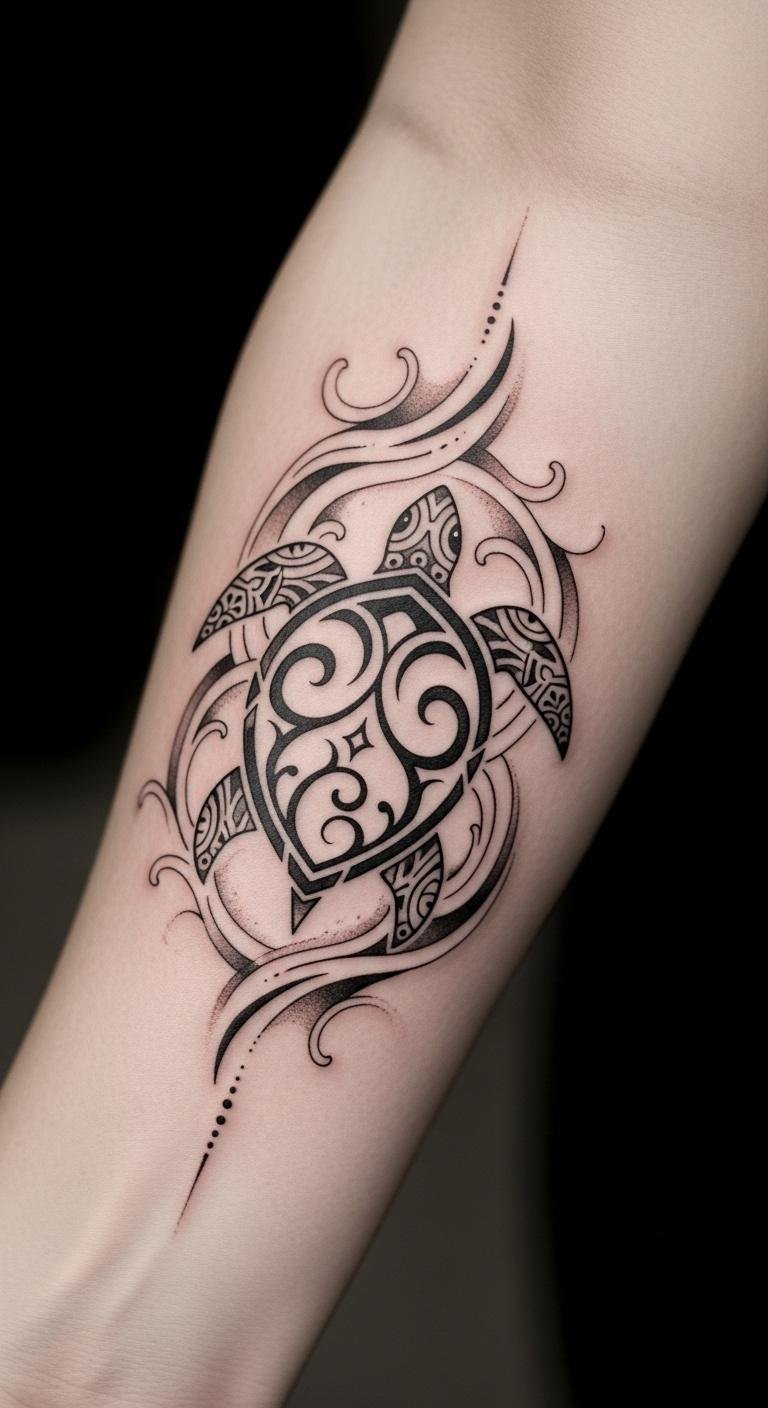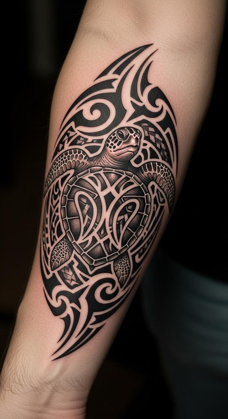 This tattoo, located on the forearm, serves as a visual testament to the protective nature of family bonds. The turtle, emblematic of safeguarding and endurance, is intricately woven with tribal motifs that resonate with strength and heritage.