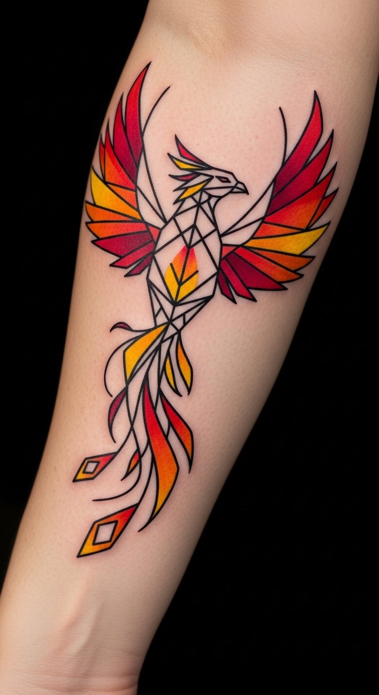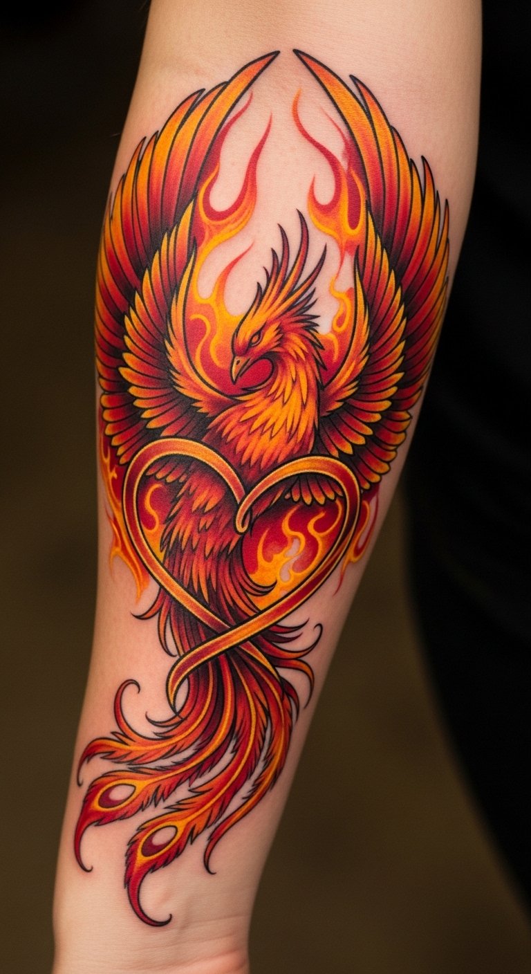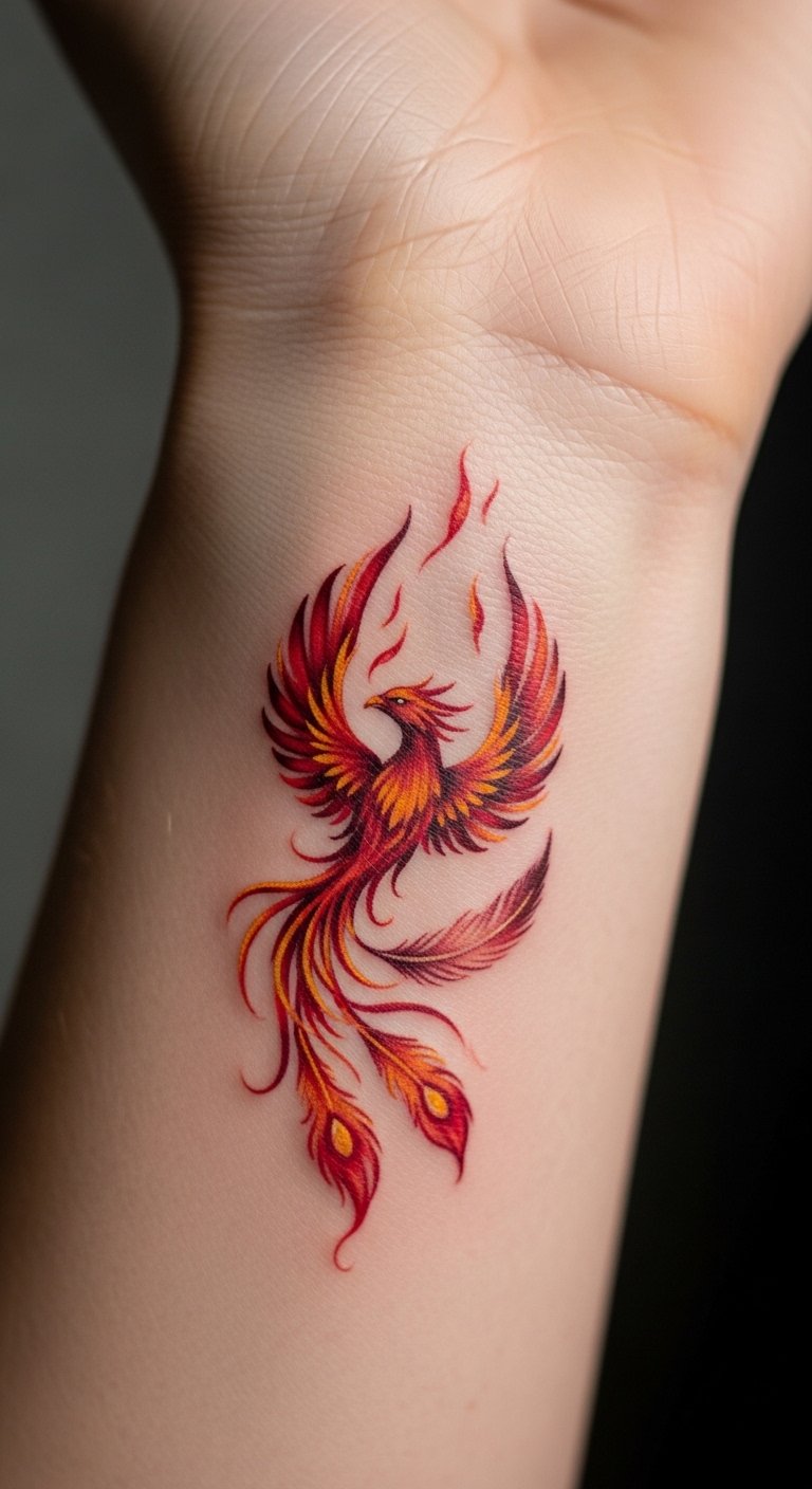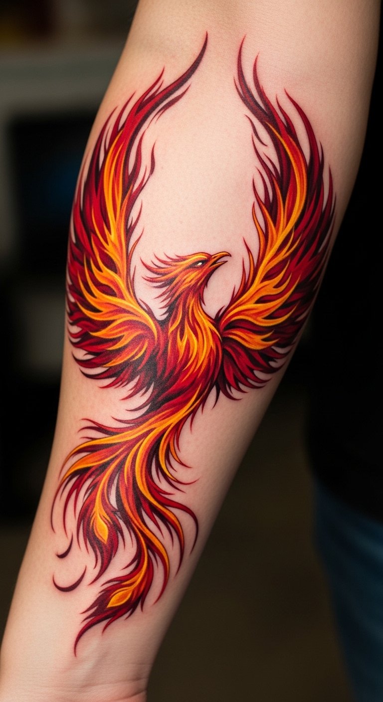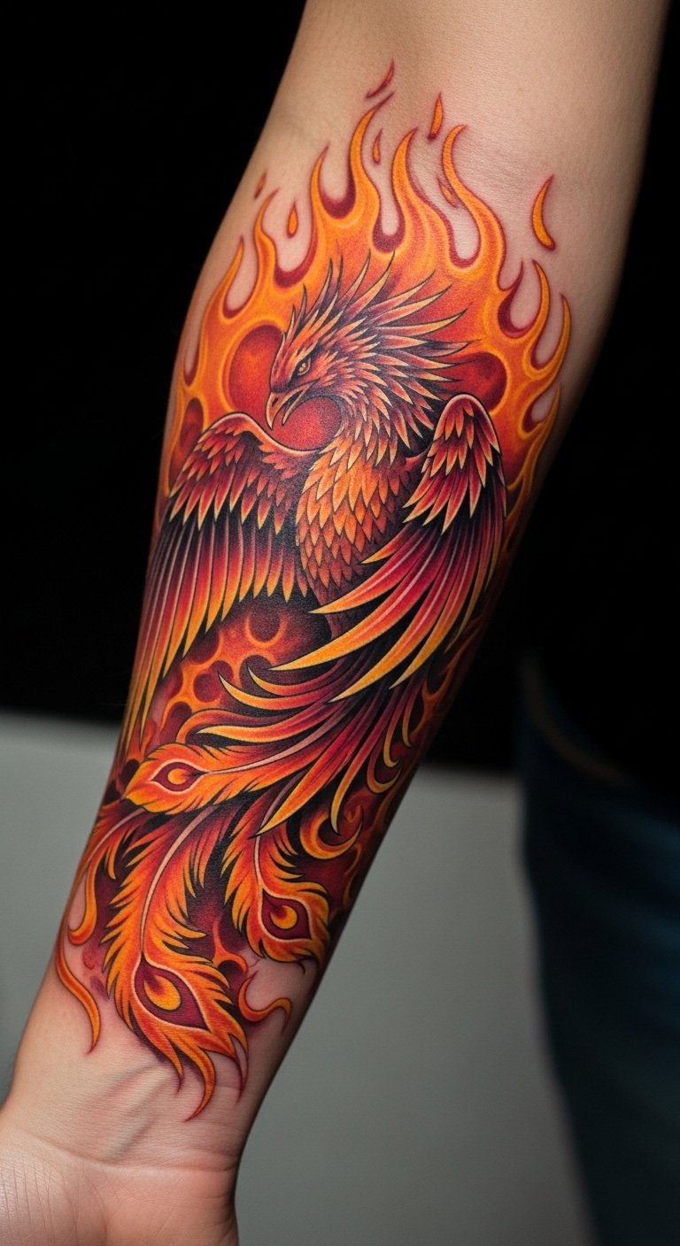 The vivid colors evoke a fiery spirit of renewal, reminding you of the strength found in rising from adversity. Positioned on the forearm, the design allows for visibility, serving as a daily reminder of your capacity to overcome challenges and embrace change with grace.