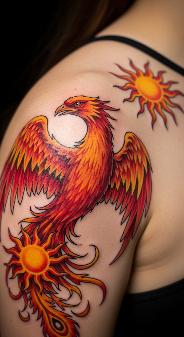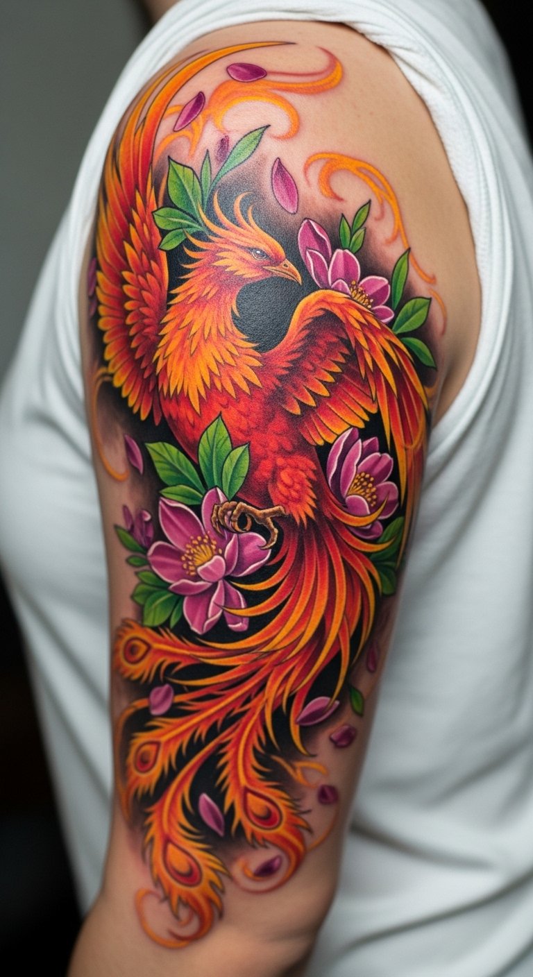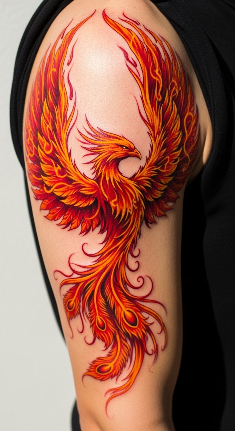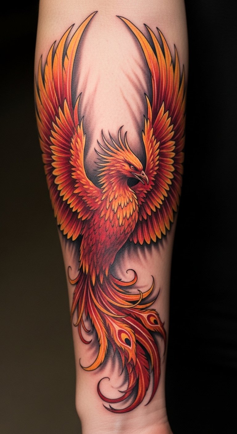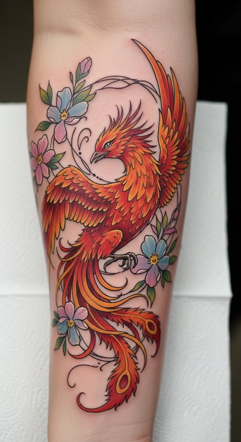 This tattoo symbolizes rebirth and the vibrant energy of life, with the phoenix representing resilience and transformation.