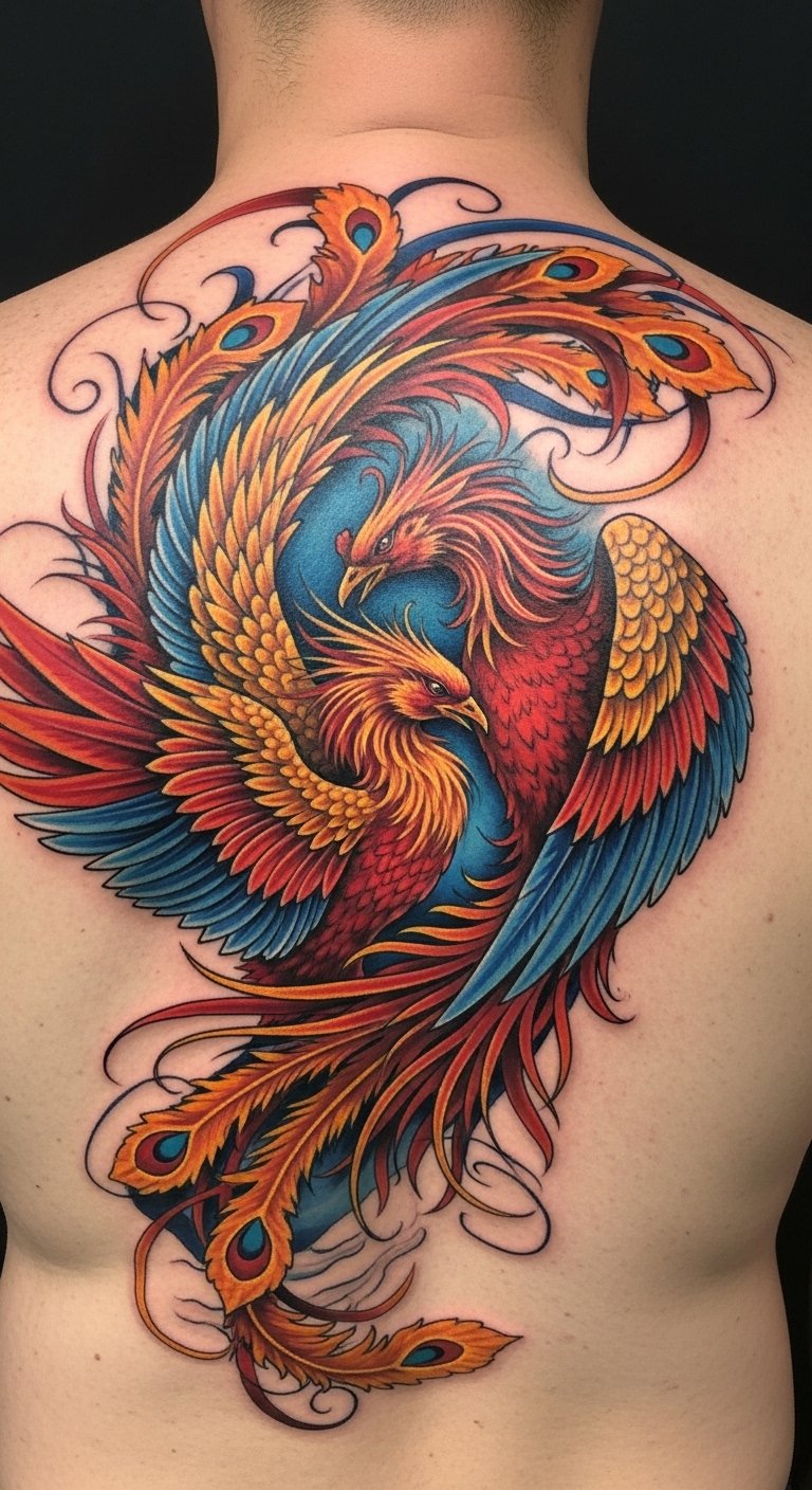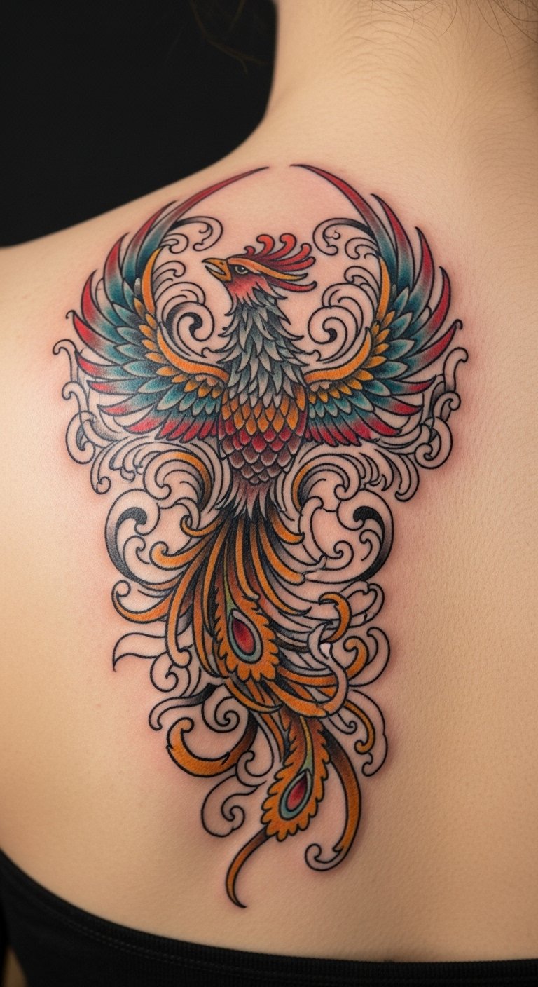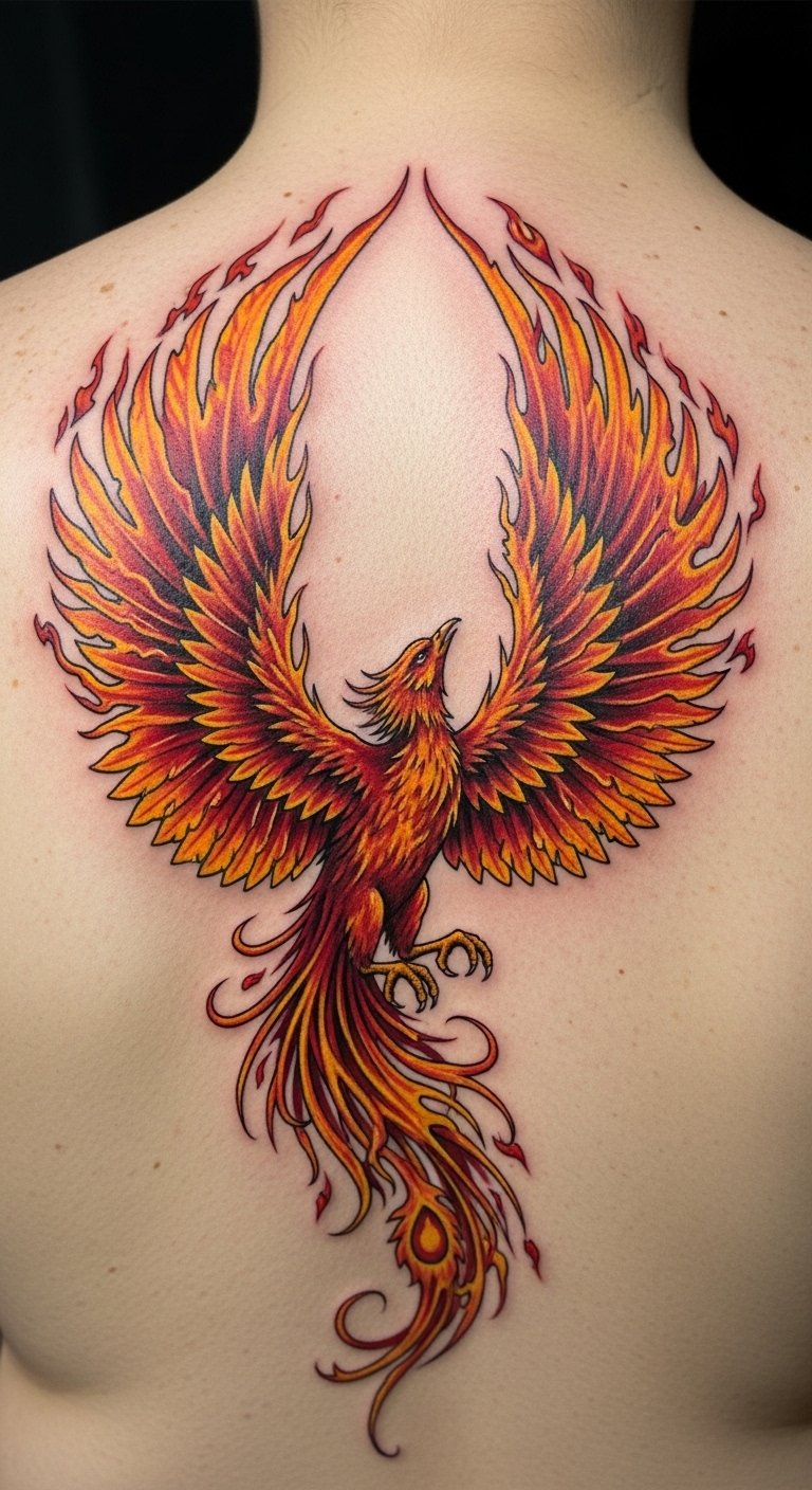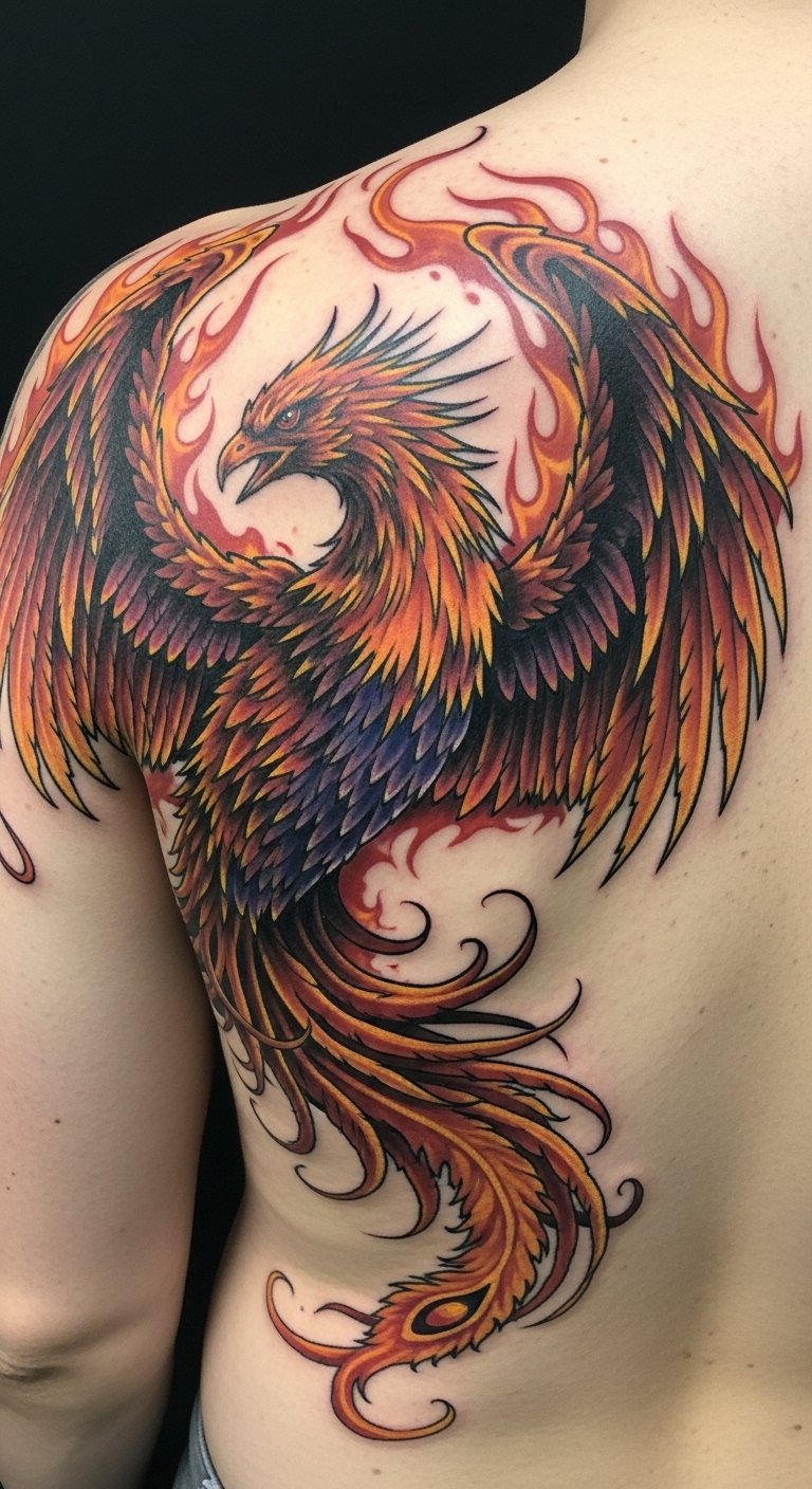 Positioned on the upper back, it serves as a powerful reminder of personal growth and renewal, allowing the wearer to carry the spirit of the phoenix with them.