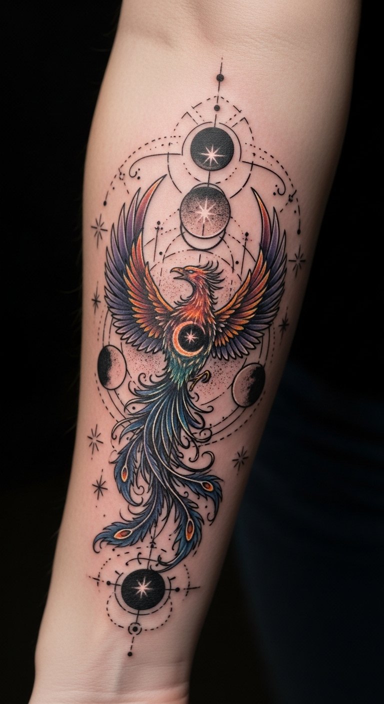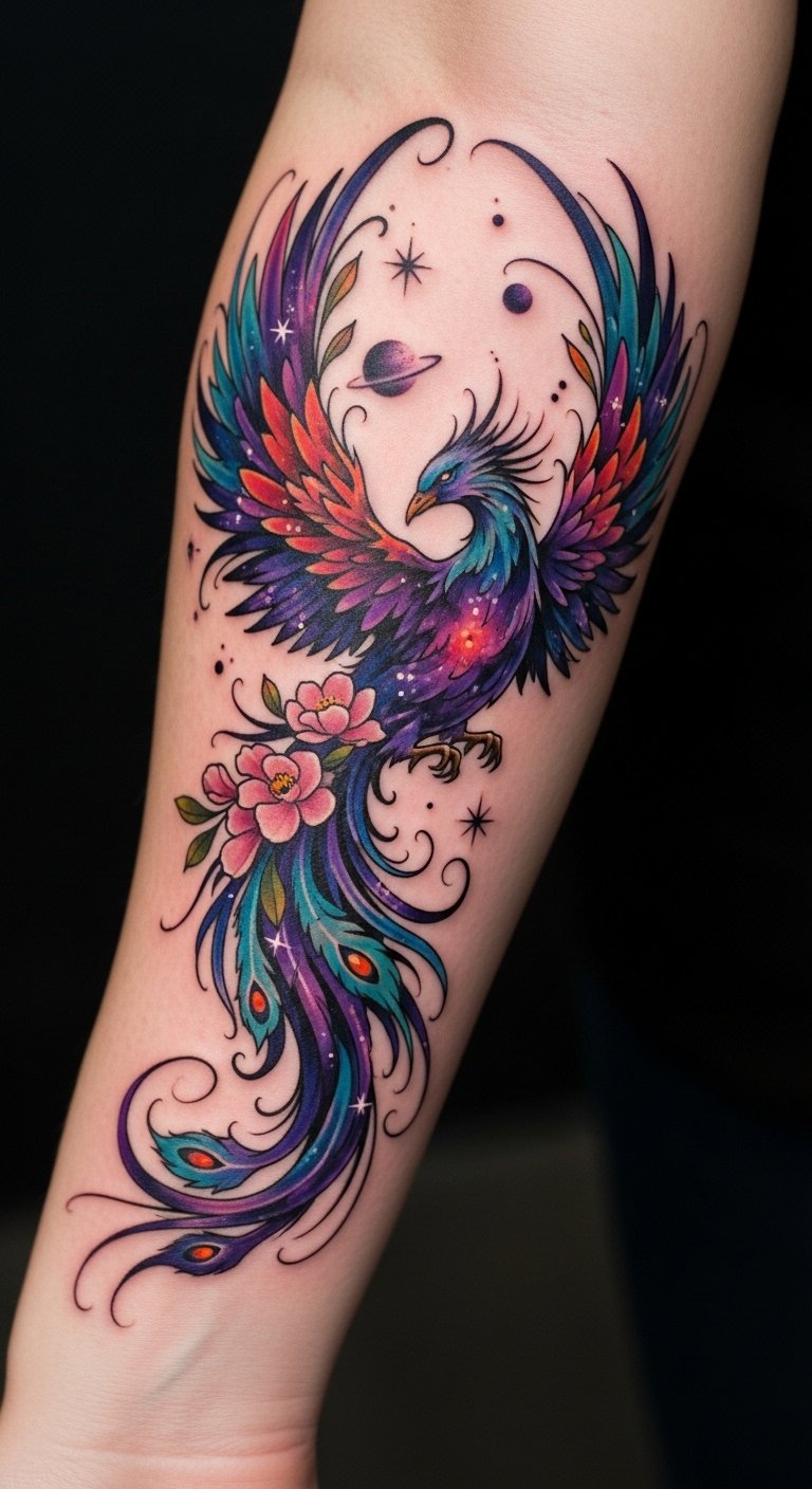 This tattoo symbolizes freedom and transformation, capturing the essence of the phoenix’s rebirth and the infinite possibilities of the universe.
