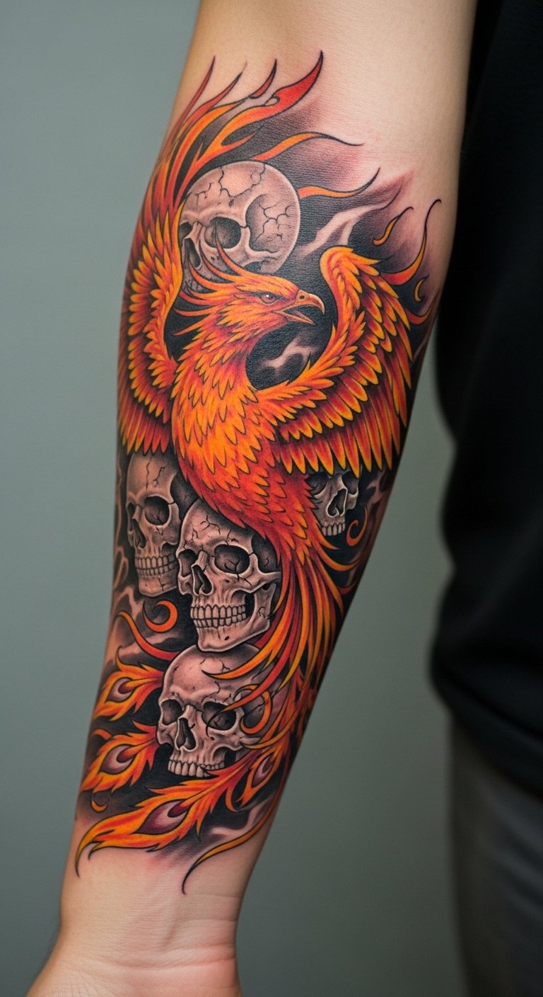 This tattoo embodies the powerful symbolism of resilience and transformation, with the phoenix representing rebirth and the skulls signifying mortality.