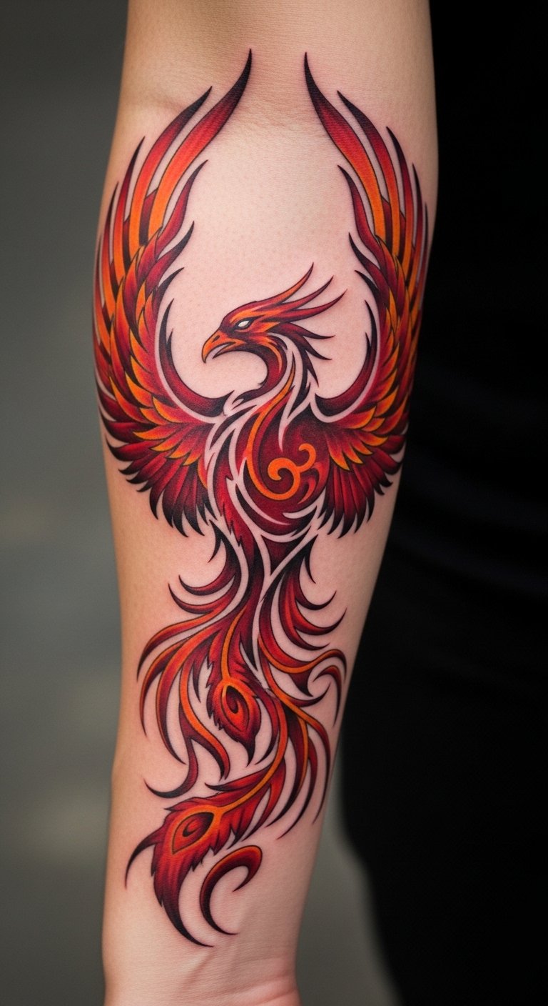 The tribal phoenix tattoo symbolizes resilience and rebirth, capturing the essence of transformation and the journey toward freedom.