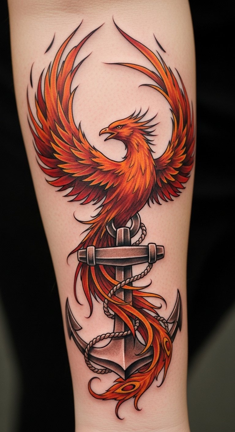 The phoenix represents resilience, rebirth, and the beauty of renewal, while the anchor signifies grounding and support amidst life’s chaos.