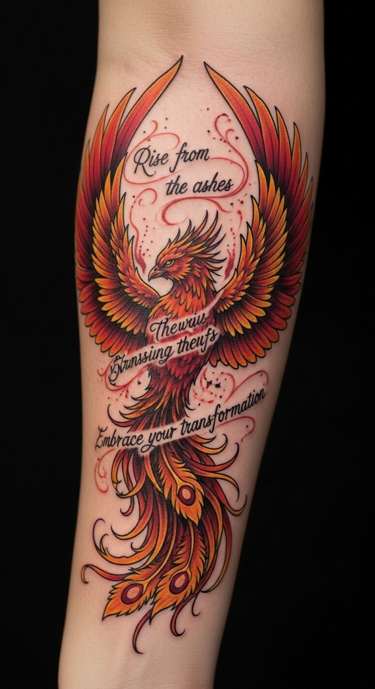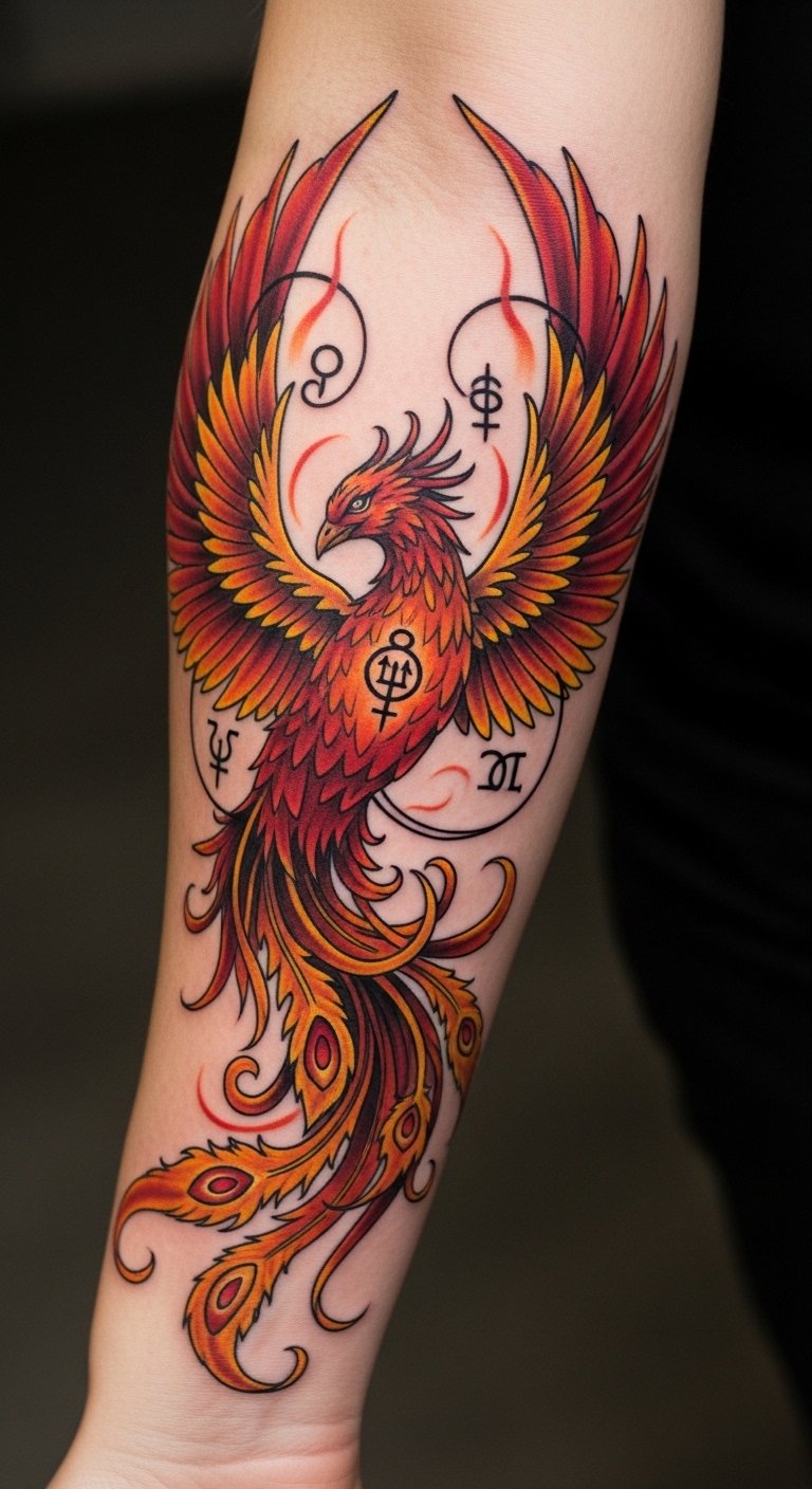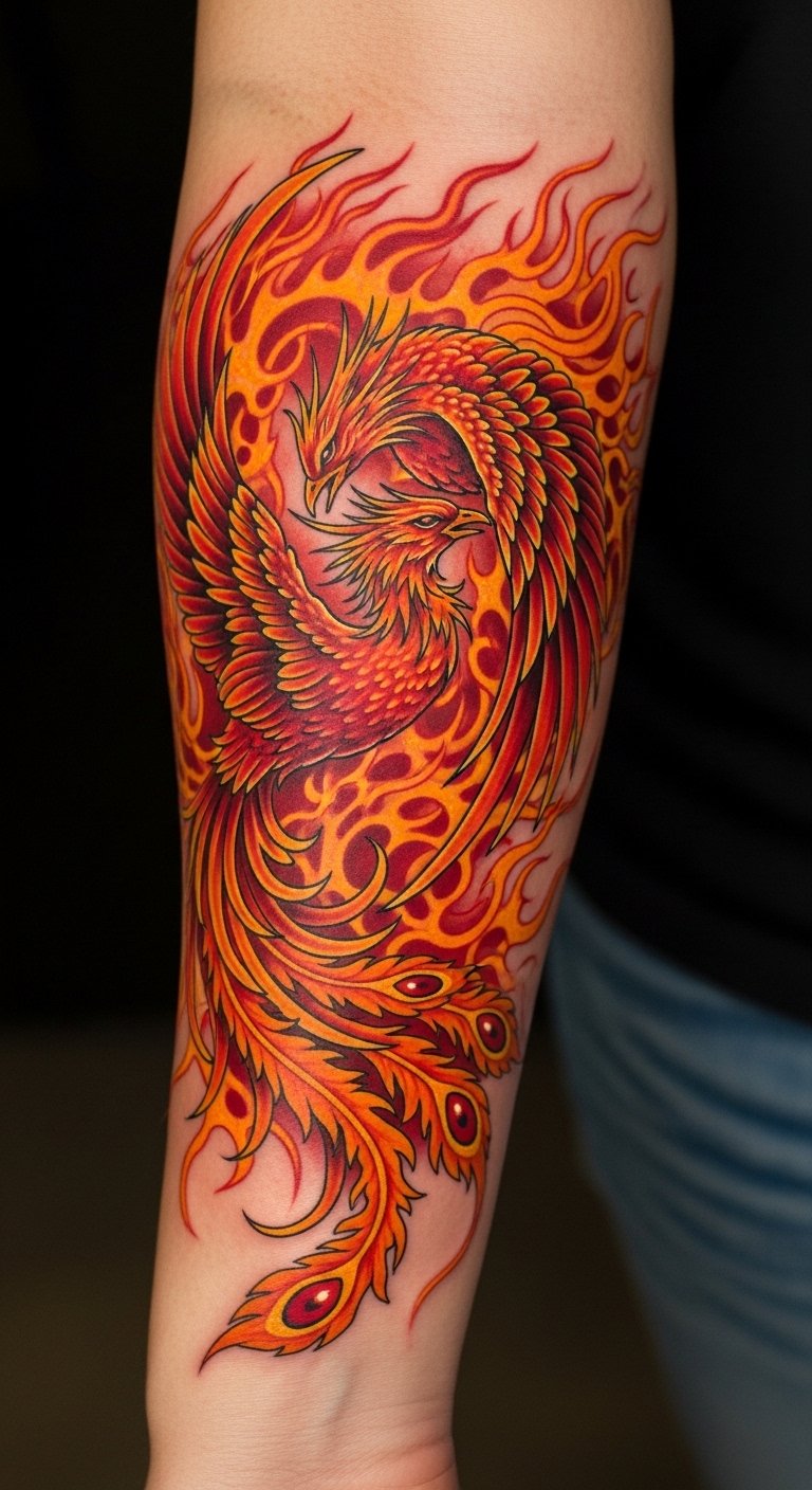 Placed on the forearm, it serves as a constant reminder of your inner strength, with each vibrant feather and flame representing a transformative chapter in your life.