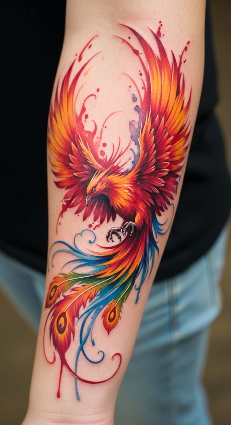 This tattoo symbolizes the powerful journey of transformation and rebirth. The vibrant colors represent the beauty of overcoming challenges, while the phoenix itself embodies strength and the freedom to rise from the ashes of the past.