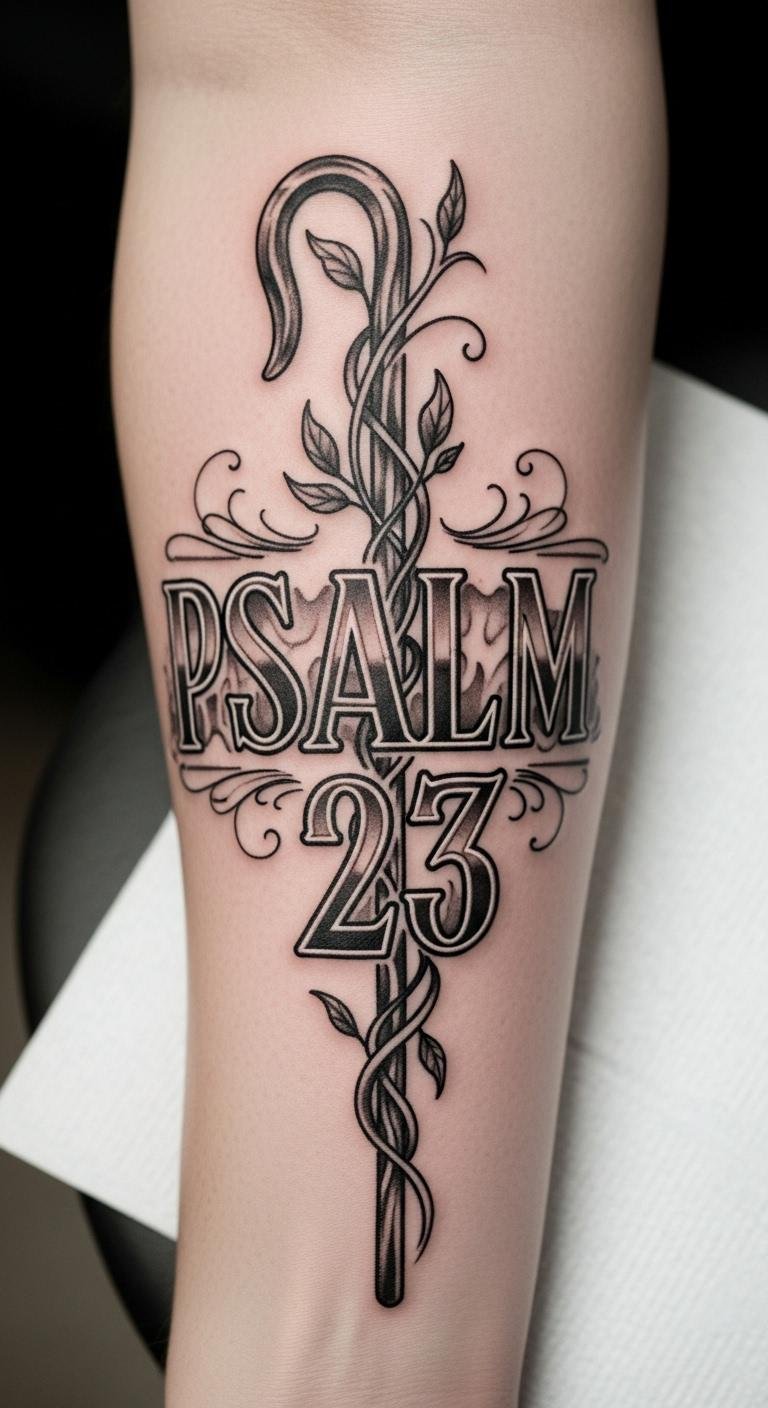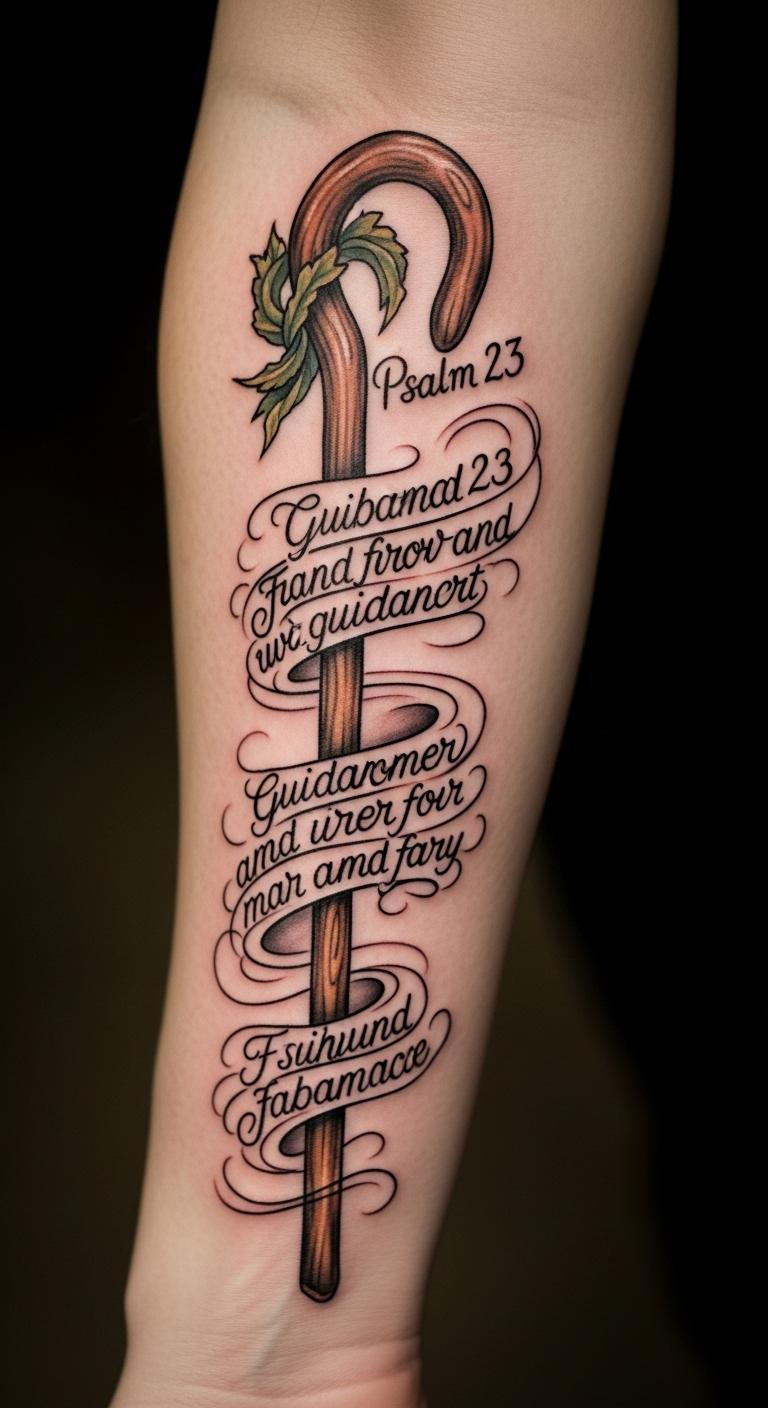 This tattoo design embodies the deep symbolism of protection and guidance found in the imagery of the shepherd’s staff, resonating with the nurturing message of Psalm 23.