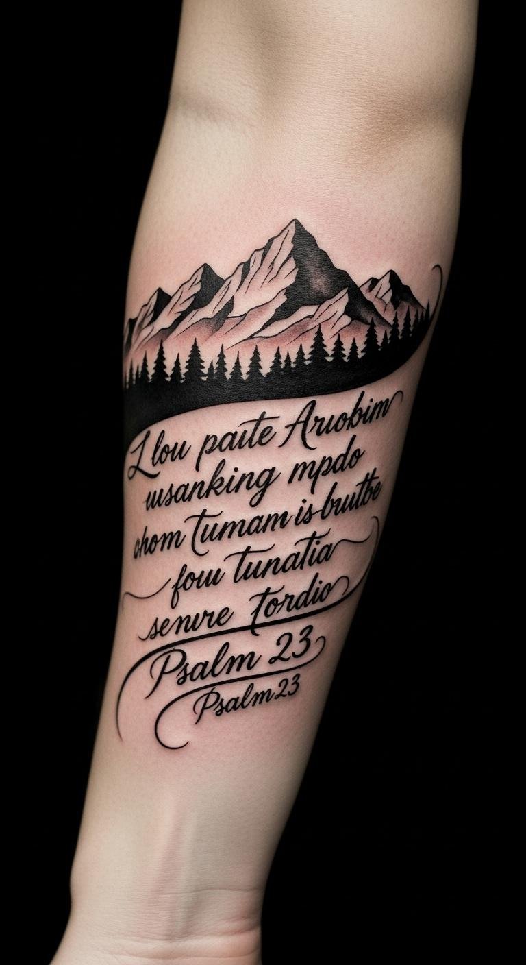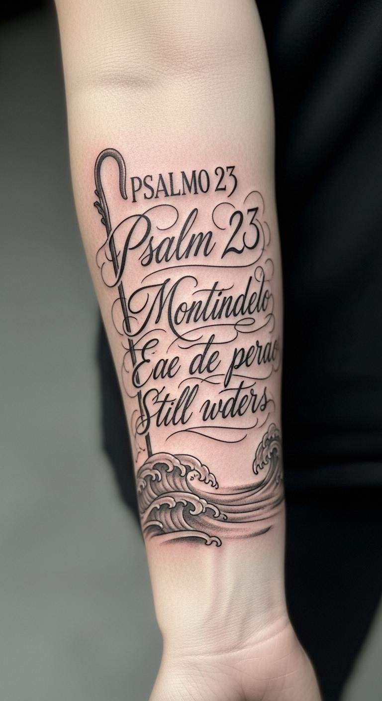 This tattoo embodies tranquility and spiritual reflection, capturing the essence of Psalm 23.
