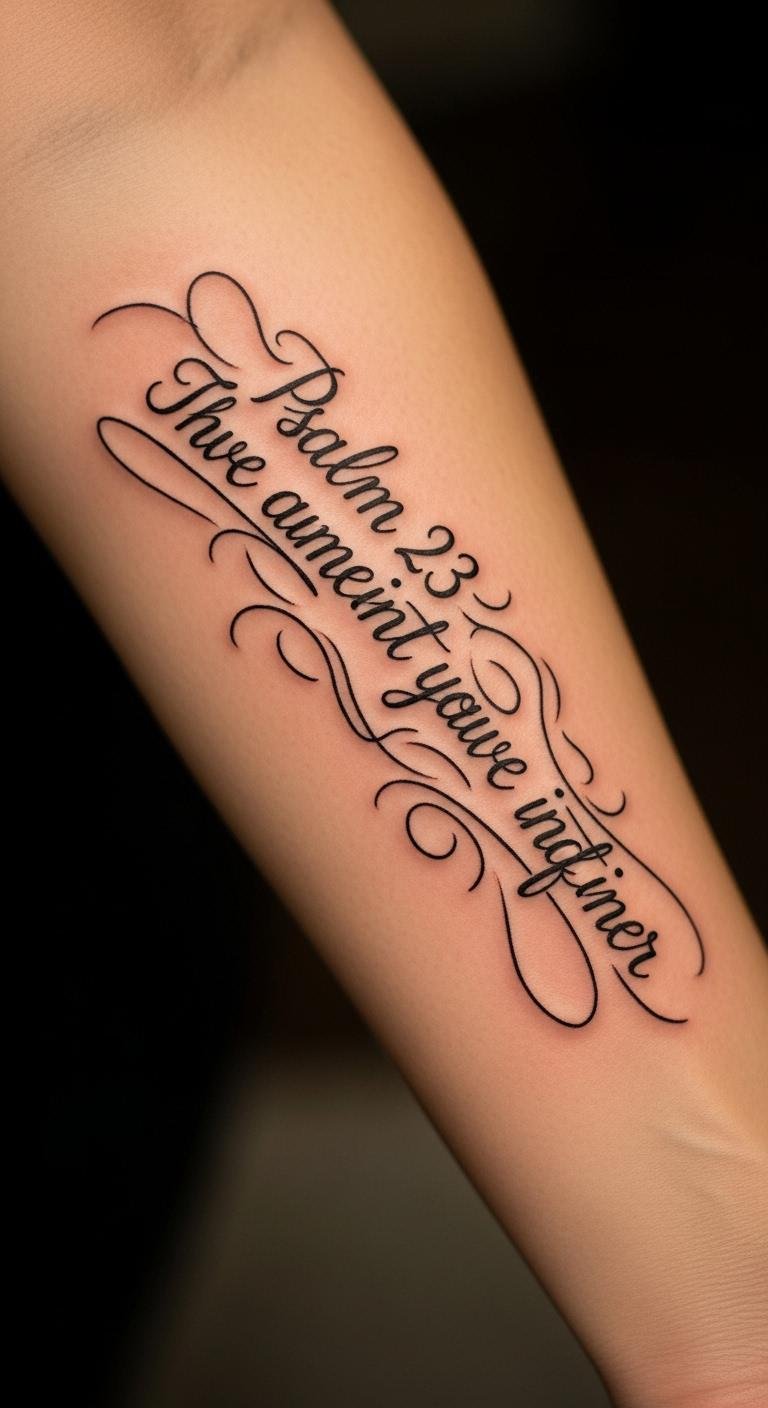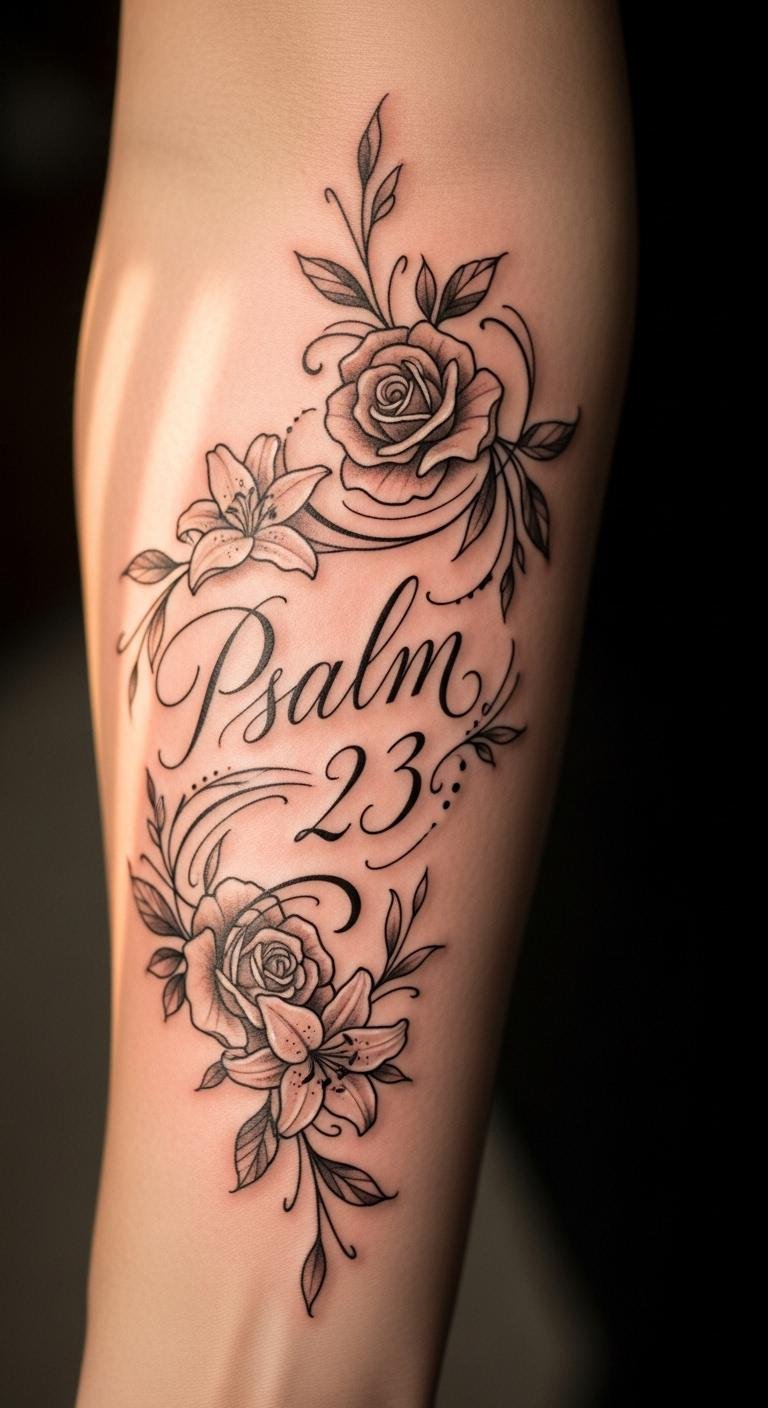 This tattoo design embodies the strength and resilience found in Psalm 23, capturing the essence of faith and protection.