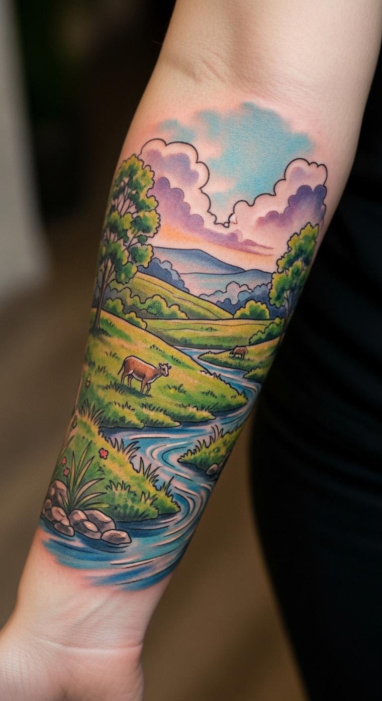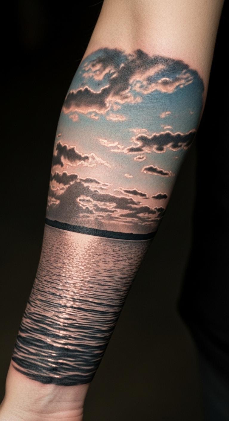 Positioned on the forearm, it serves as a constant reminder of one’s journey towards peace and divine guidance. The flowing waters symbolize the ebb and flow of life, while the open sky represents freedom and faith.