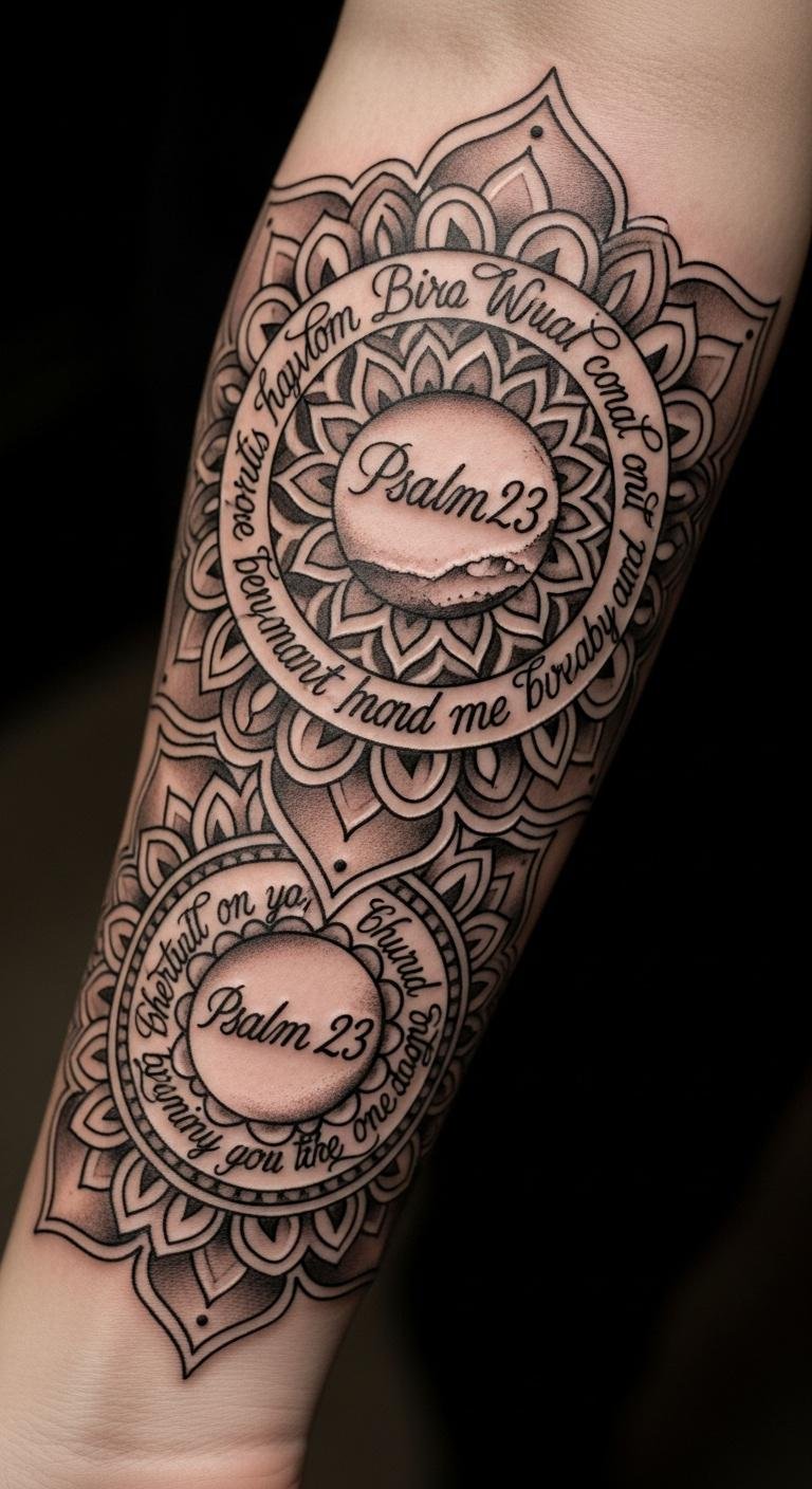 This design not only reflects personal expression but also serves as a protective embrace, enveloping the wearer in a sense of peace and strength derived from their beliefs, creating a powerful emotional connection to the verse.