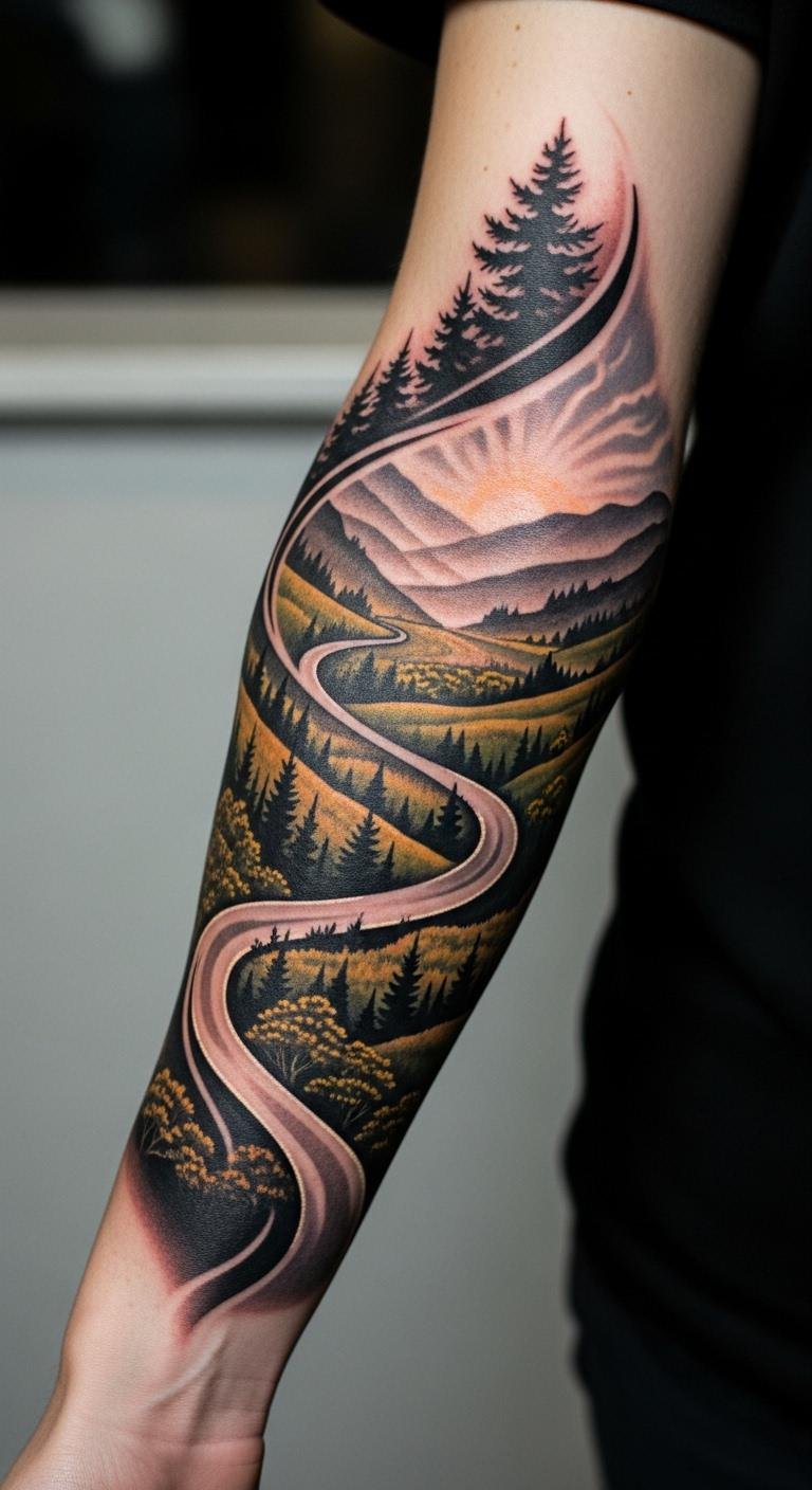 The tattoo’s placement on the forearm allows for easy visibility and connection to the wearer’s journey, symbolizing strength and resilience in daily life.