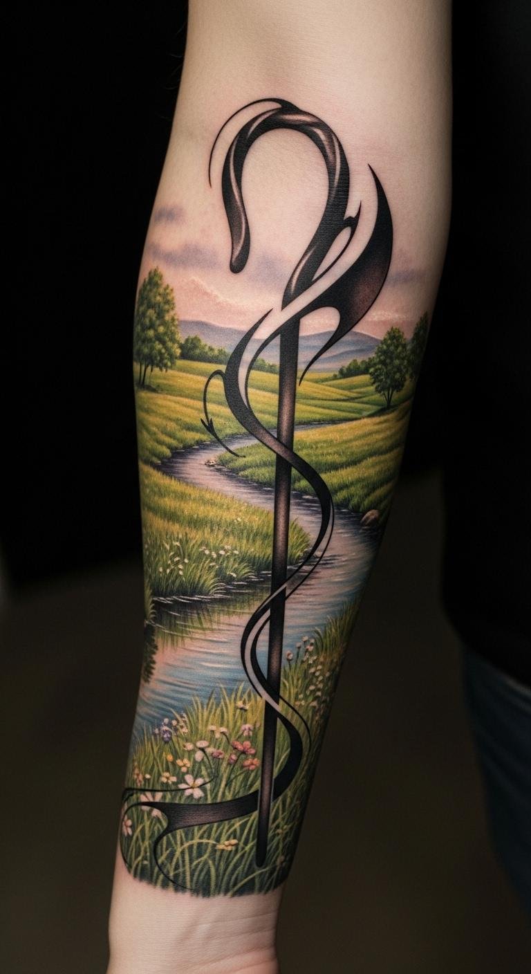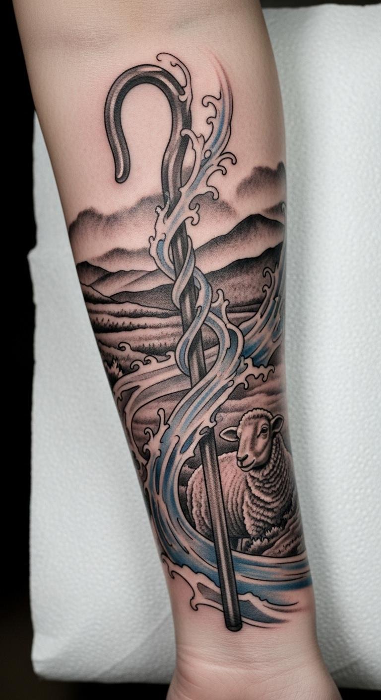This tattoo symbolizes guidance and protection, as the shepherd’s staff represents strength in leadership and care, while the flowing waters signify tranquility and spiritual nourishment.