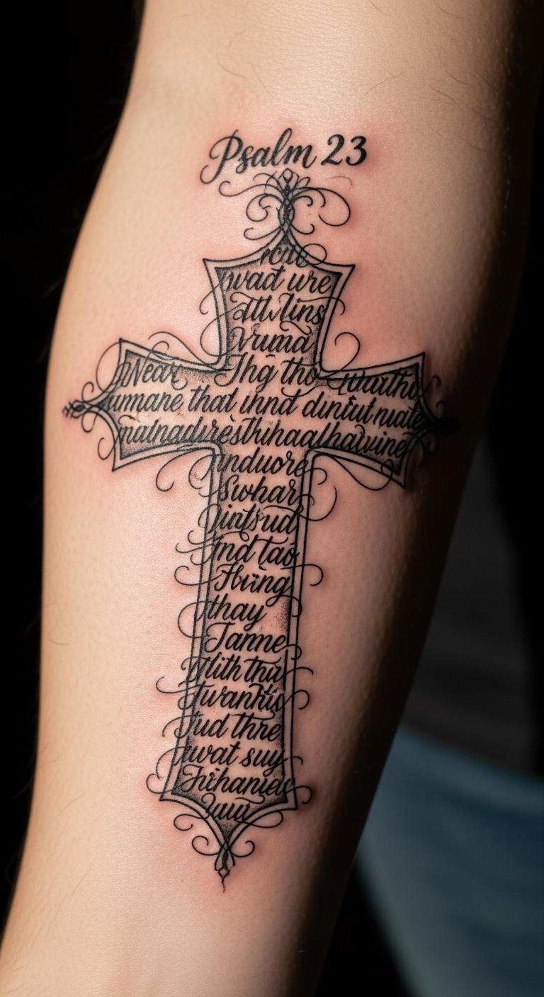 The cross symbolizes divine protection, while the flowing script of Psalm 23 embodies resilience through life’s challenges.