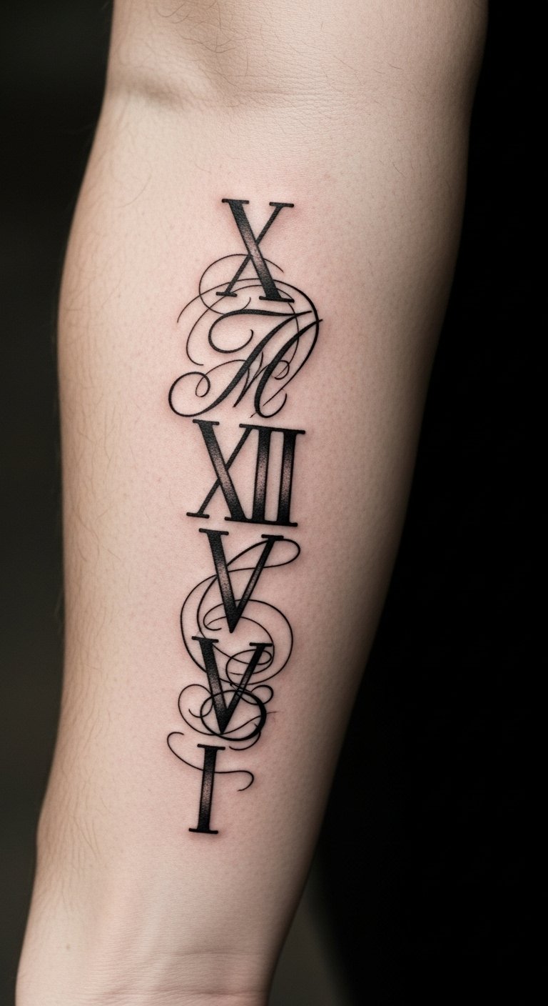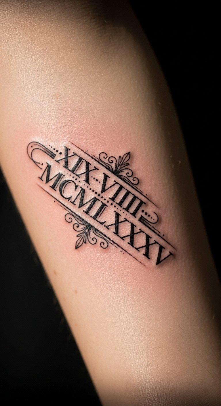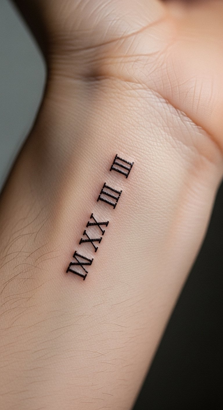 The Roman numeral tattoo on the inner forearm symbolizes significant milestones in life, each numeral representing a cherished memory or achievement.