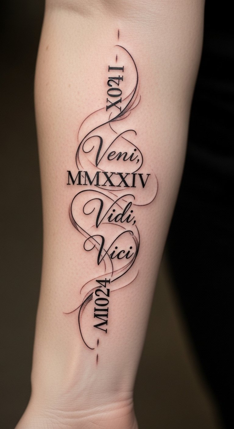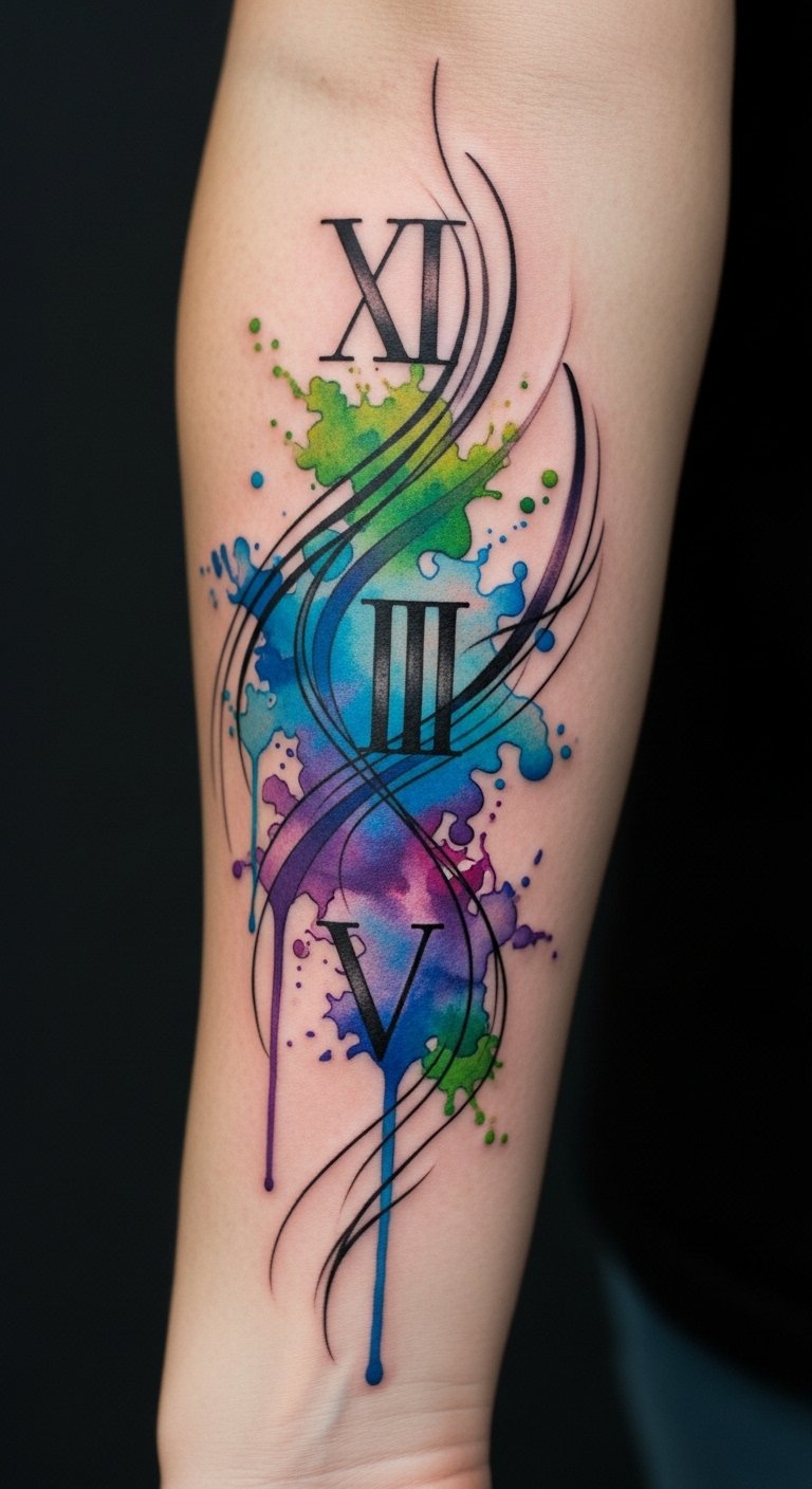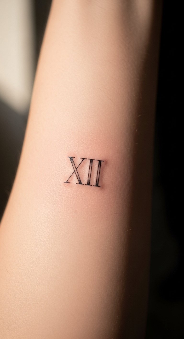 The Roman numeral tattoo on the inner forearm symbolizes significant milestones in life, each numeral representing a cherished memory or achievement.