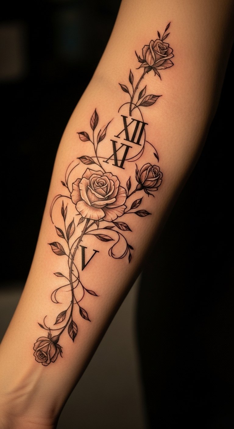This tattoo design represents the fusion of time and nature, where the Roman numerals symbolize important milestones or dates in one’s life, while the roses convey love, passion, and beauty.