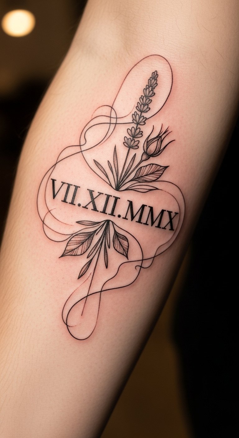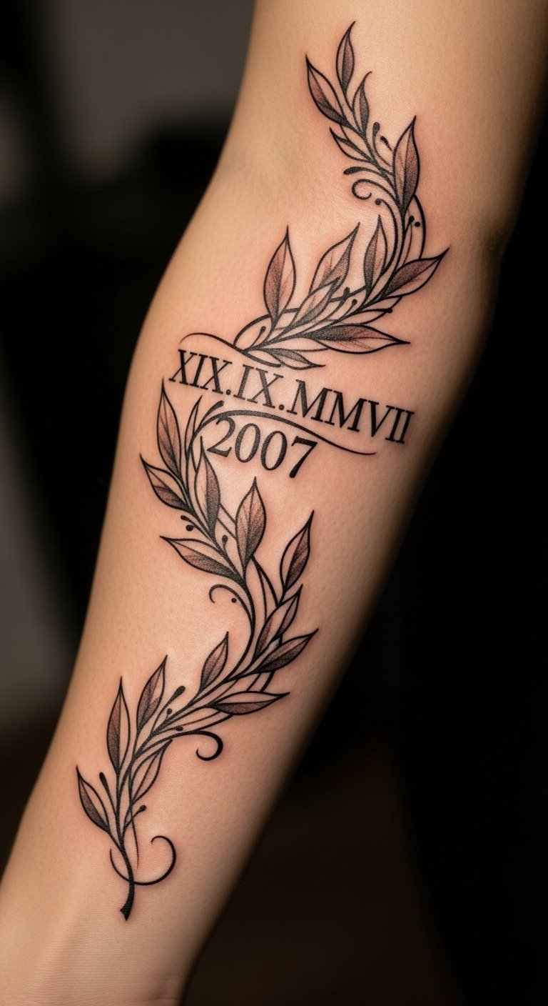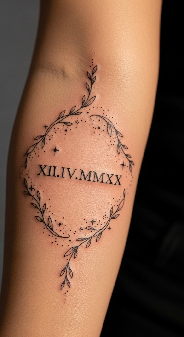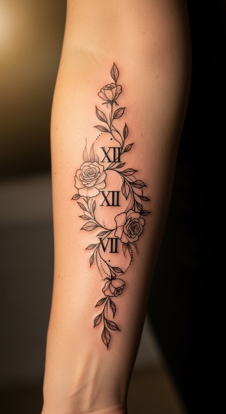 This tattoo design symbolizes significant moments in life, with the Roman numerals representing a personal milestone or cherished date.
