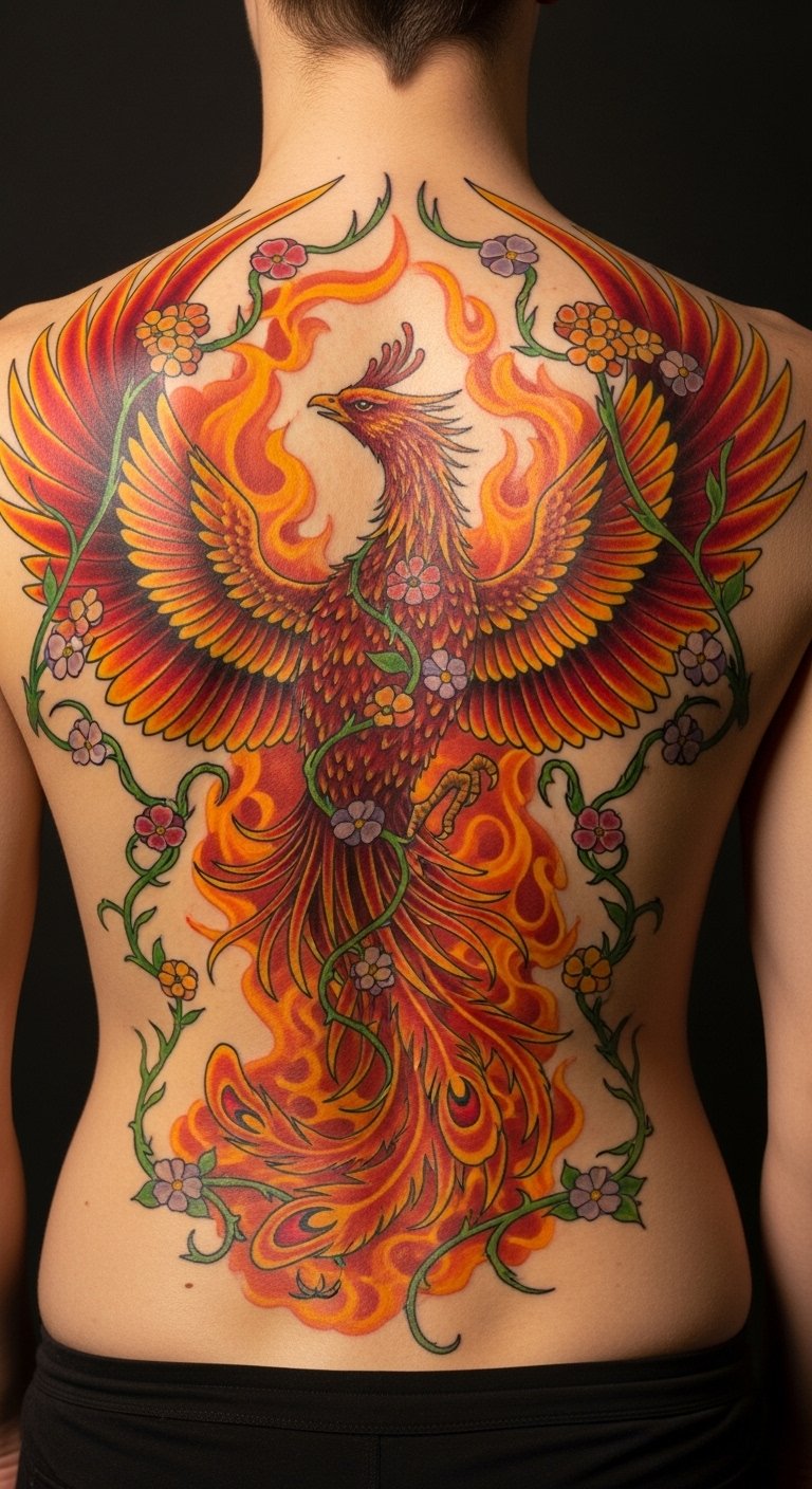 This tattoo symbolizes rebirth and resilience, as the phoenix represents overcoming adversity and emerging stronger.