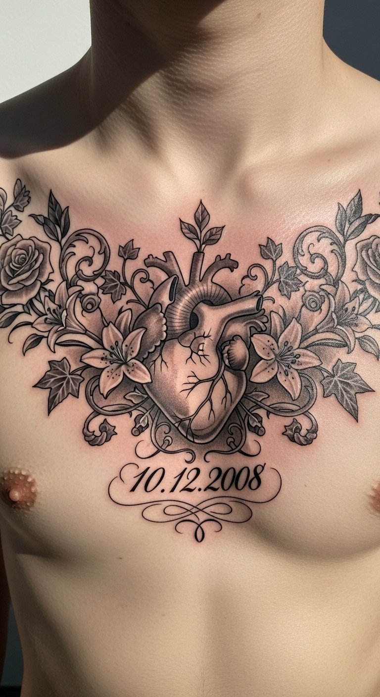 The significant date serves as a reminder of pivotal moments that shape one’s journey. Positioned on the upper chest, it remains an intimate and powerful expression of identity and connection, allowing the wearer to celebrate the bonds that define their life story.
