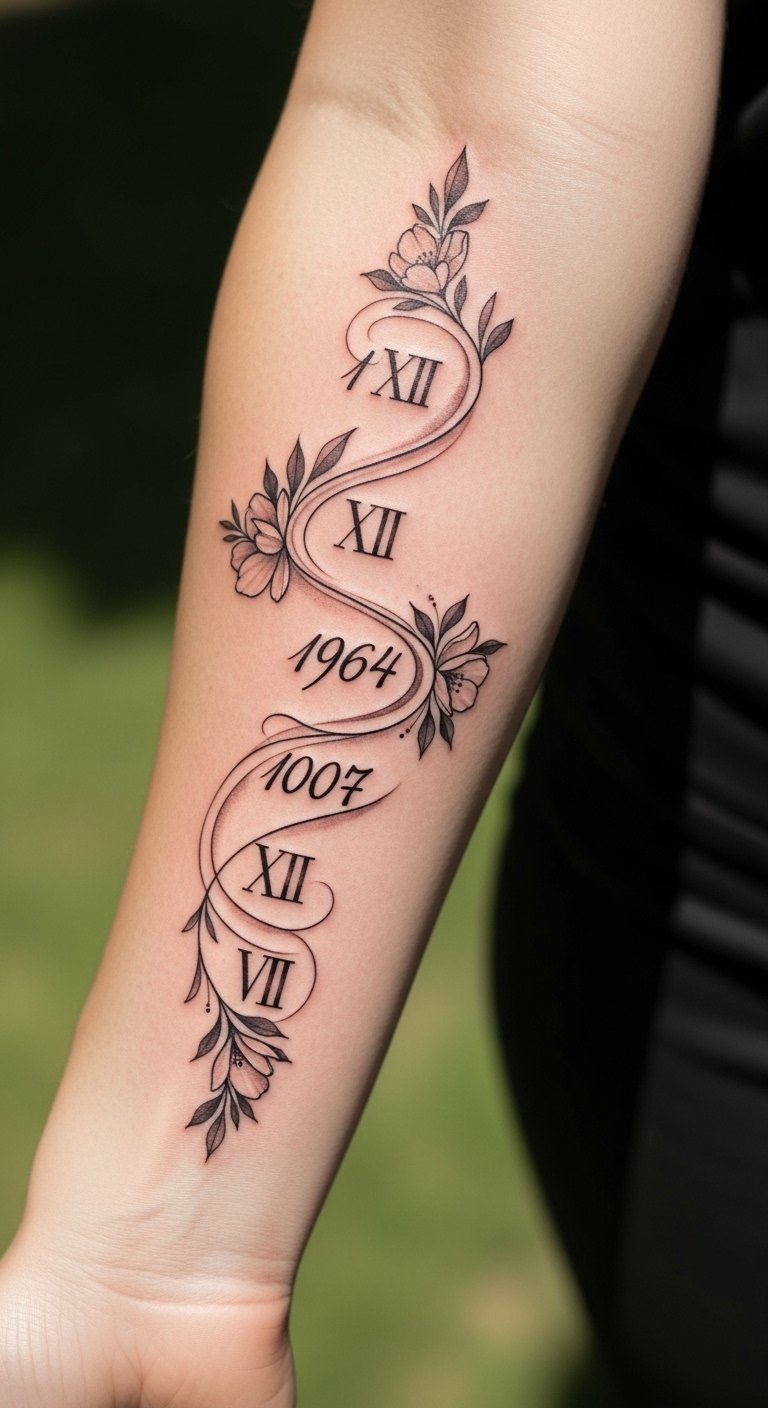 The combination of numbers and floral elements symbolizes growth and resilience, while the placement on the forearm allows for easy visibility, inviting conversations about its meaning.
