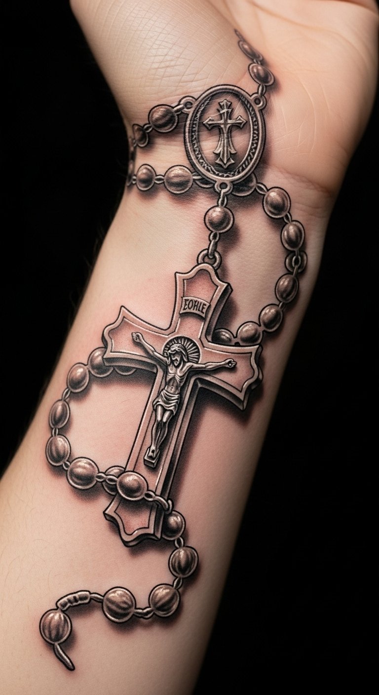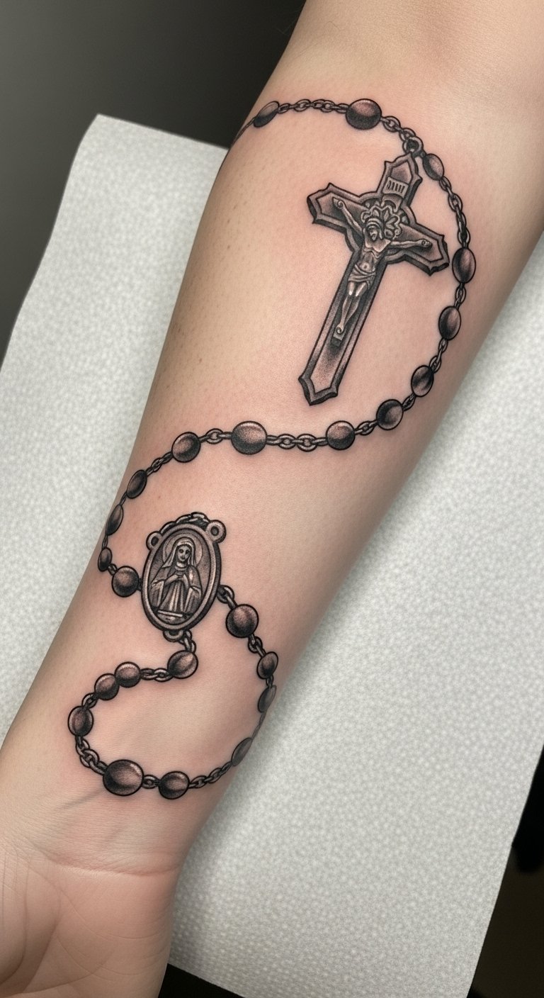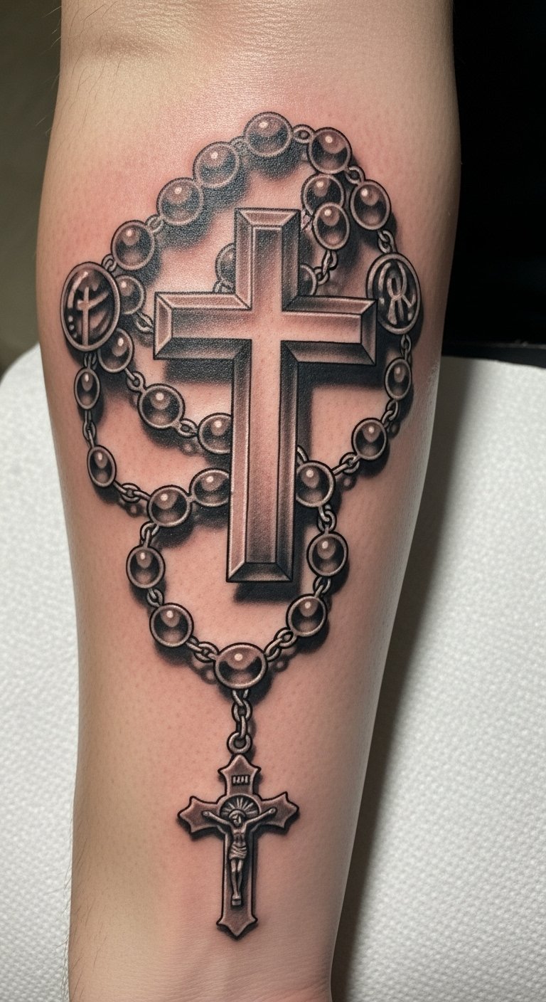 This tattoo symbolizes a deep commitment to faith, representing the union of prayer and sacrifice through the rosary and cross.