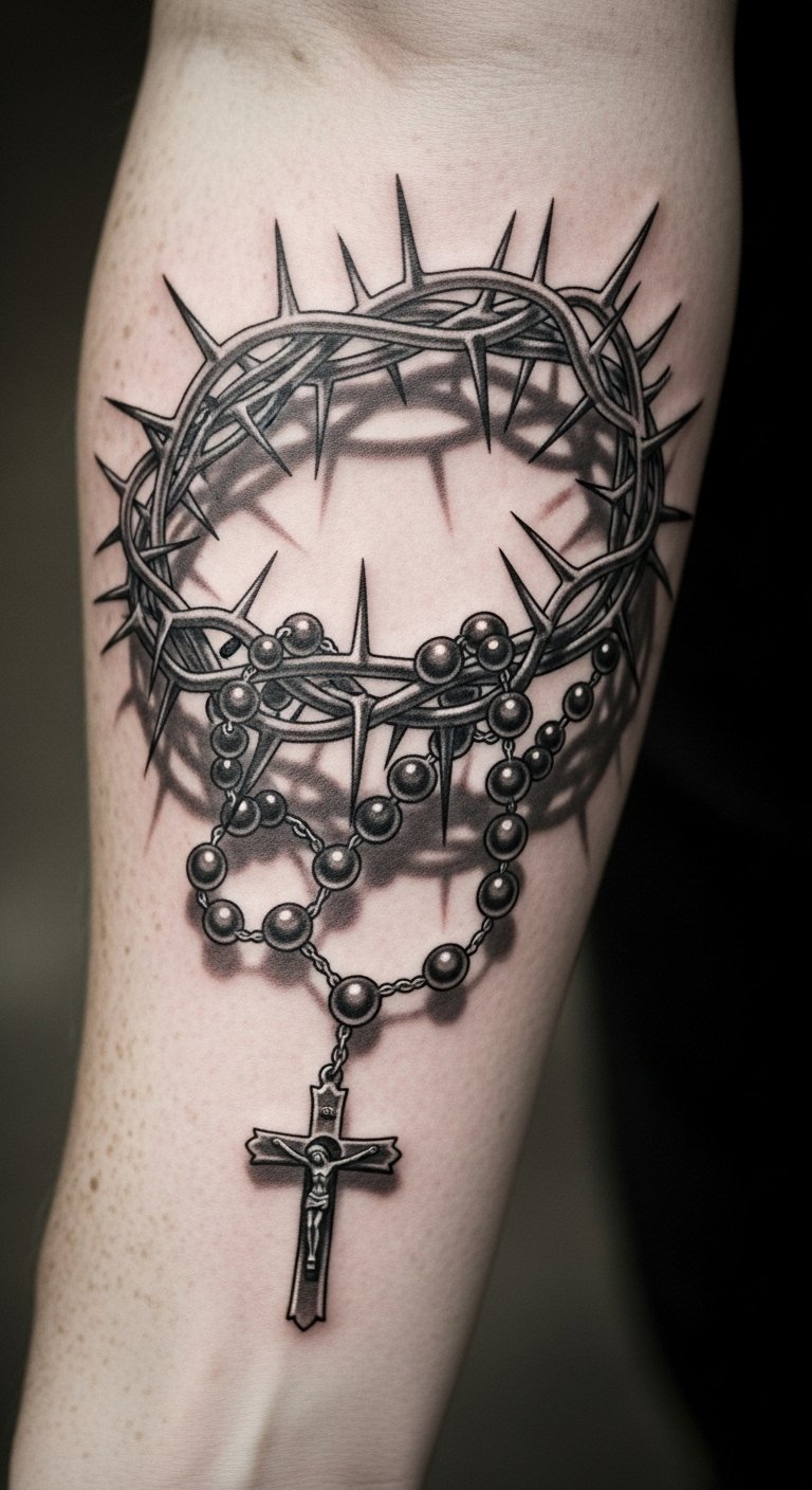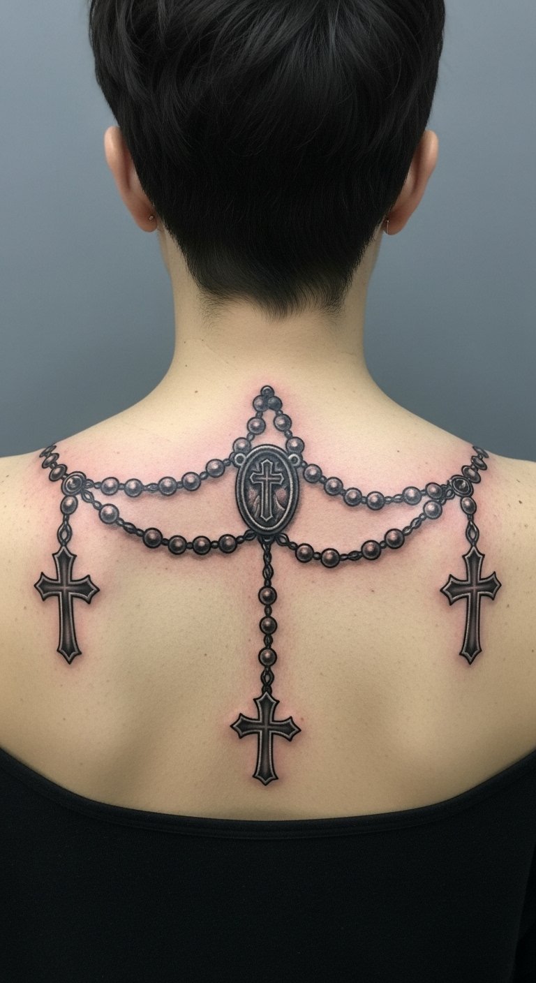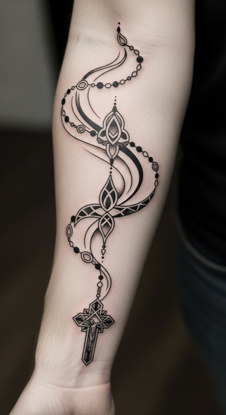 This tattoo symbolizes a deep commitment to faith, representing the union of prayer and sacrifice through the rosary and cross.