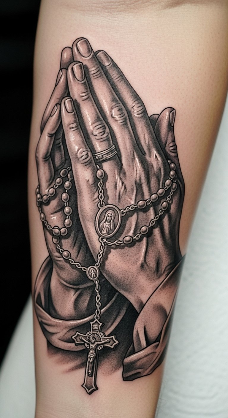 The tattoo of praying hands with a rosary embodies a deep sense of spirituality and devotion, serving as a constant reminder of the importance of prayer and seeking guidance.