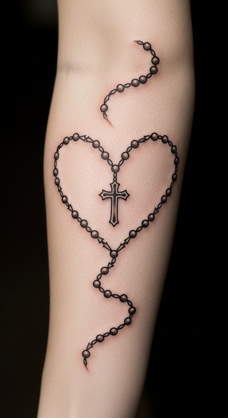 The heart-shaped rosary tattoo symbolizes the intertwining of faith and love, embodying a powerful representation of devotion.