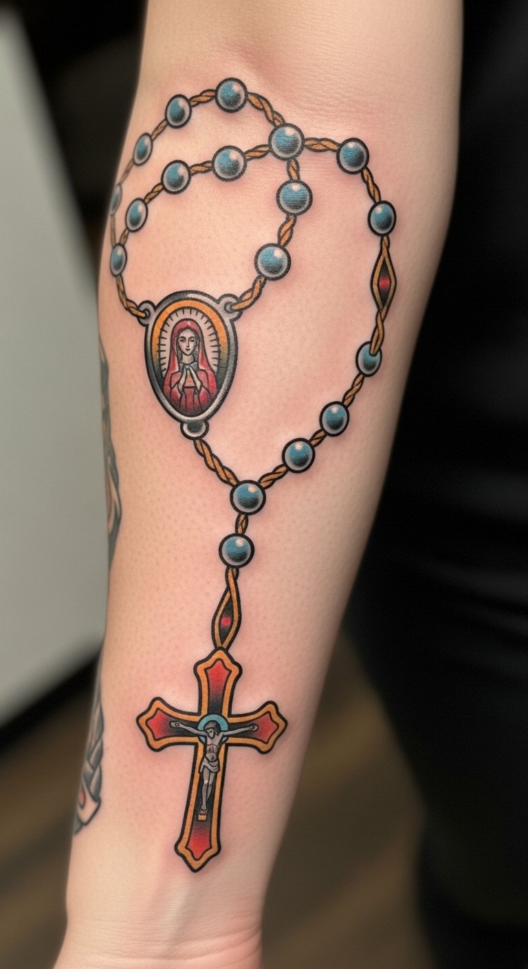 This tattoo symbolizes the wearer’s spiritual journey, intertwining devotion and resilience with each bead and cross represented in vivid colors.