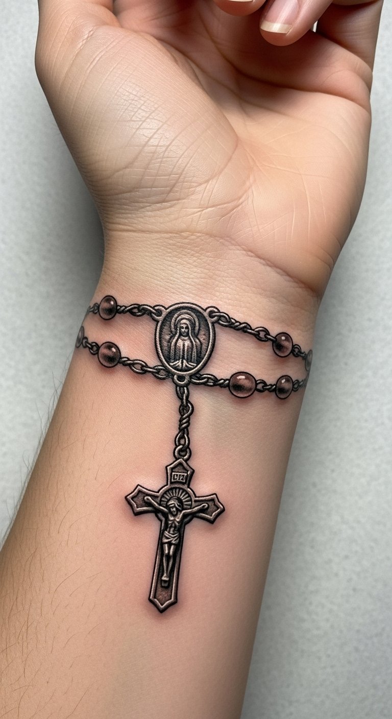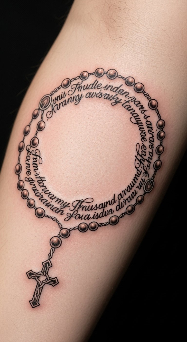 The rosary tattoo represents a deep connection to faith and spirituality, symbolizing the endless cycle of prayer and devotion.