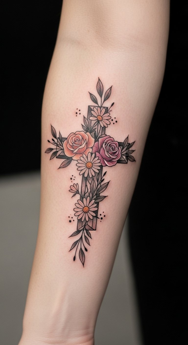 This tattoo design embodies a profound connection between spirituality and the beauty of life, positioning the cross as a steadfast symbol of faith amidst the flourishing flowers that represent growth and renewal.