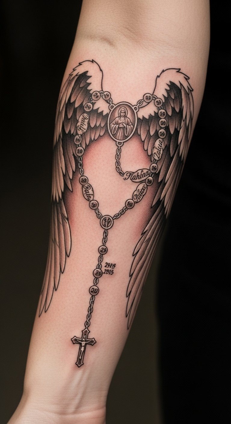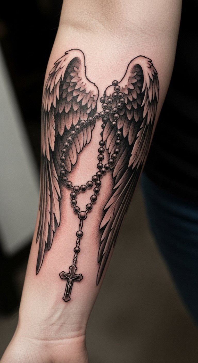 The tattoo symbolizes the divine connection between faith and protection, serving as a reminder of angelic guardianship.