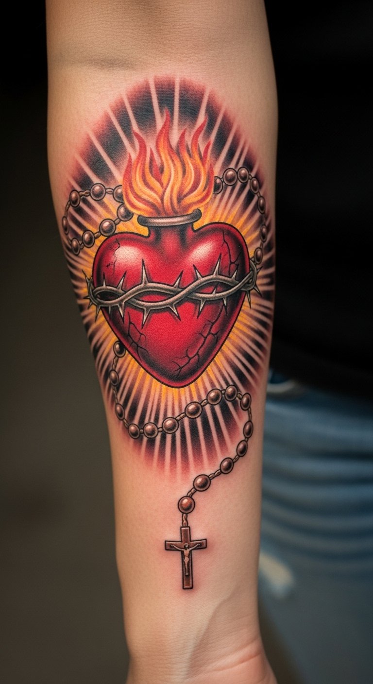 This tattoo serves as a powerful emblem of faith, merging two profound symbols of Catholic spirituality. The Sacred Heart embodies divine love, radiating warmth and compassion, while the rosary signifies devotion and peace.