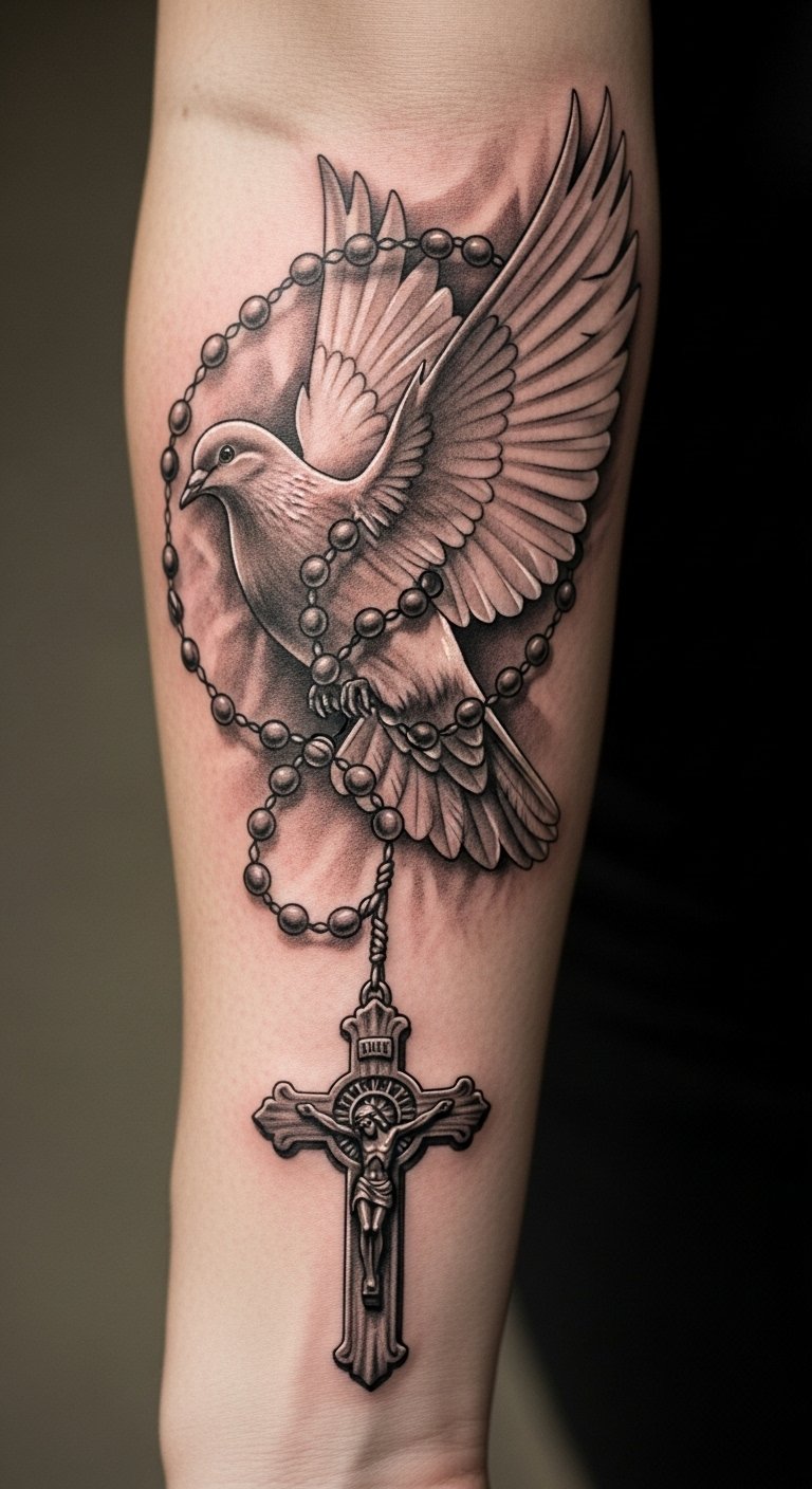 In this tattoo design, the dove symbolizes peace and hope, harmoniously merging with the rosary’s spiritual essence.