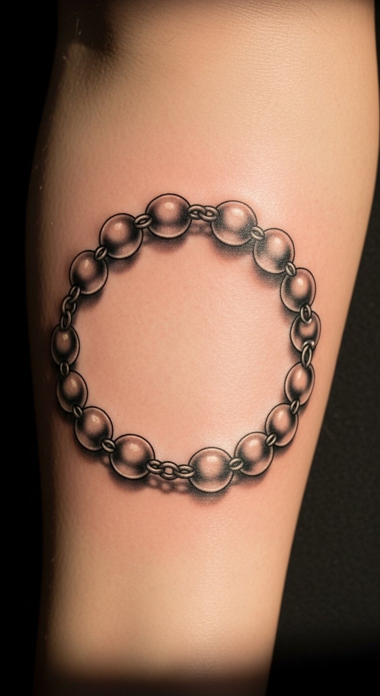 This tattoo design symbolizes unwavering faith and devotion, with the beaded chain enhancing the spiritual connection of the cross. Each bead represents moments of hope, intertwining the wearer’s journey with divine energy.